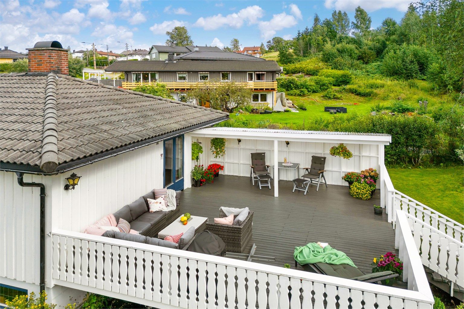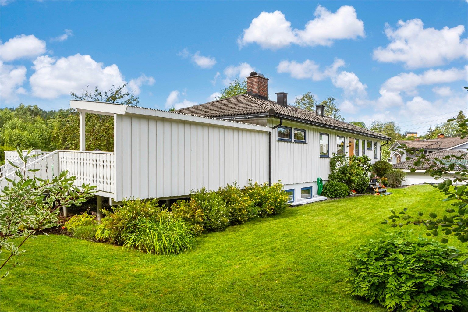 - Stor delvis overbygget terrasse mot sør. Her er det plass til hele familien. Videre utgang til hagen fra terrassen.