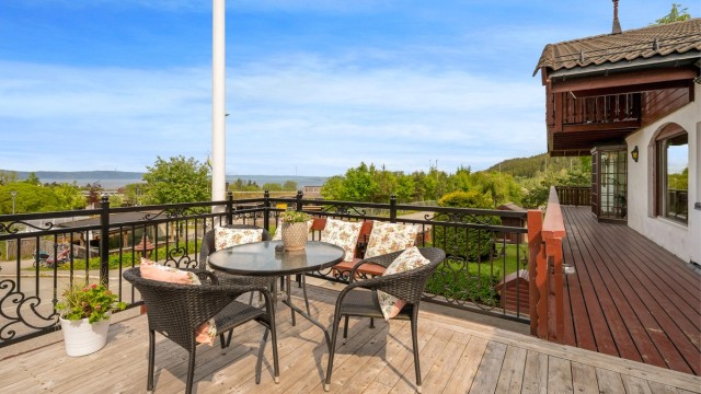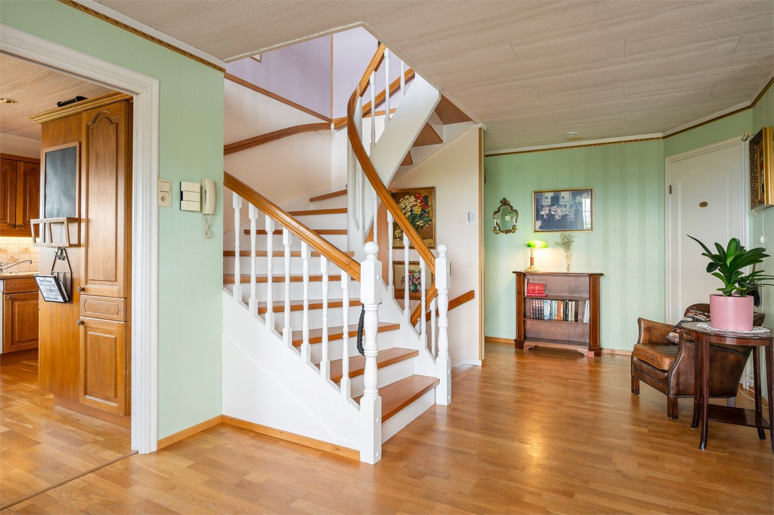 Tomta ligger adskilt fra omkringliggende eiendommer, omgitt av hage og et skrånende terreng som sørger for både le og skjerming. Beliggenhet i blindvei gjør området ekstra fredelig, og den vakre utsikten bidrar med et åpent og vidstrakt skue mot fjorden.
