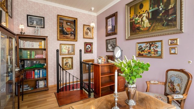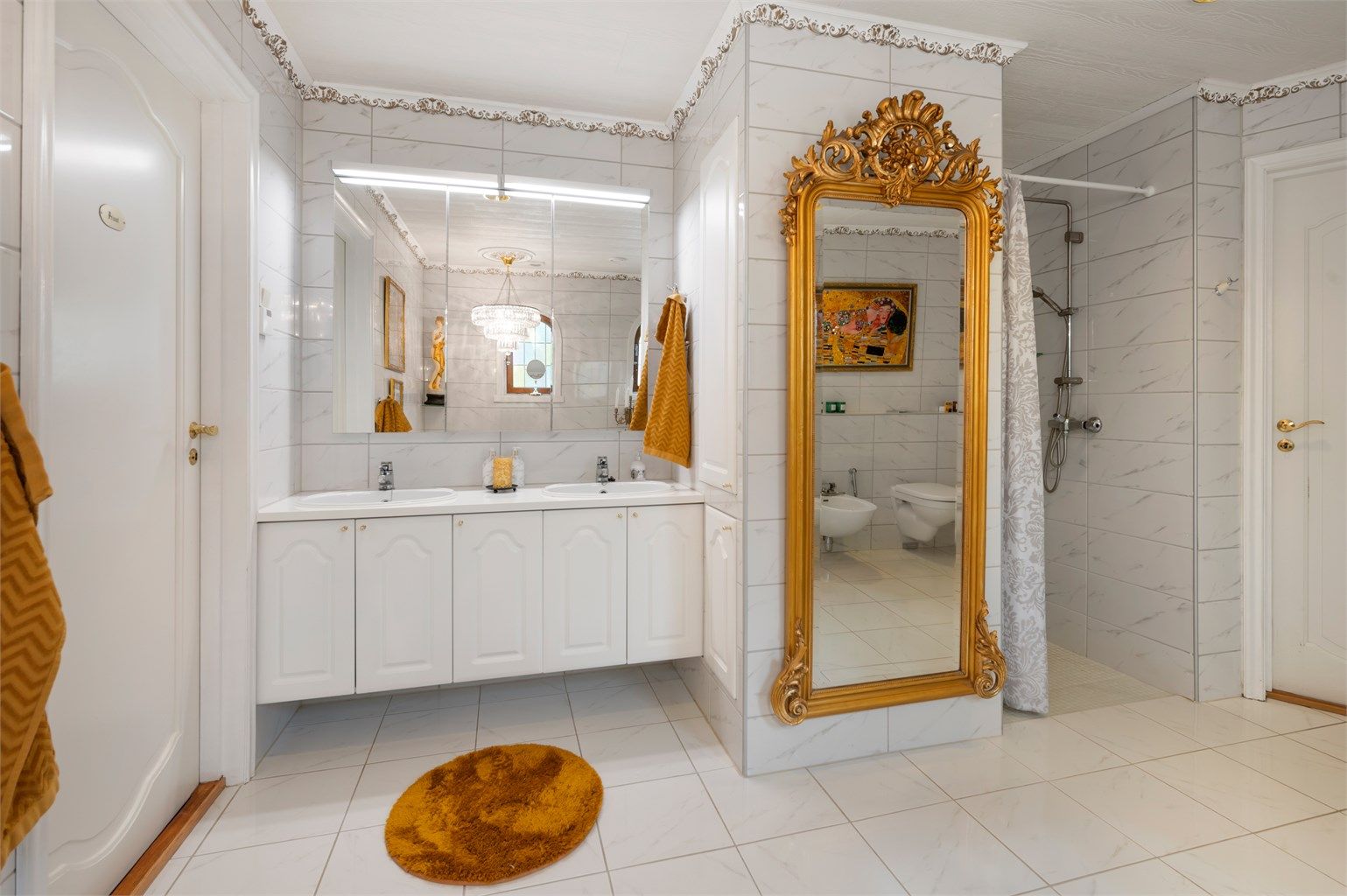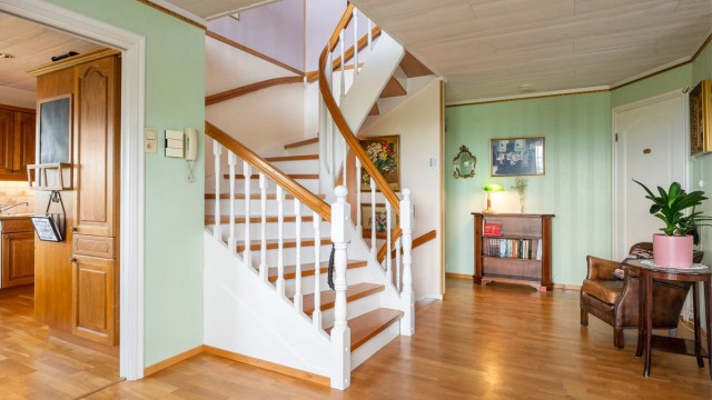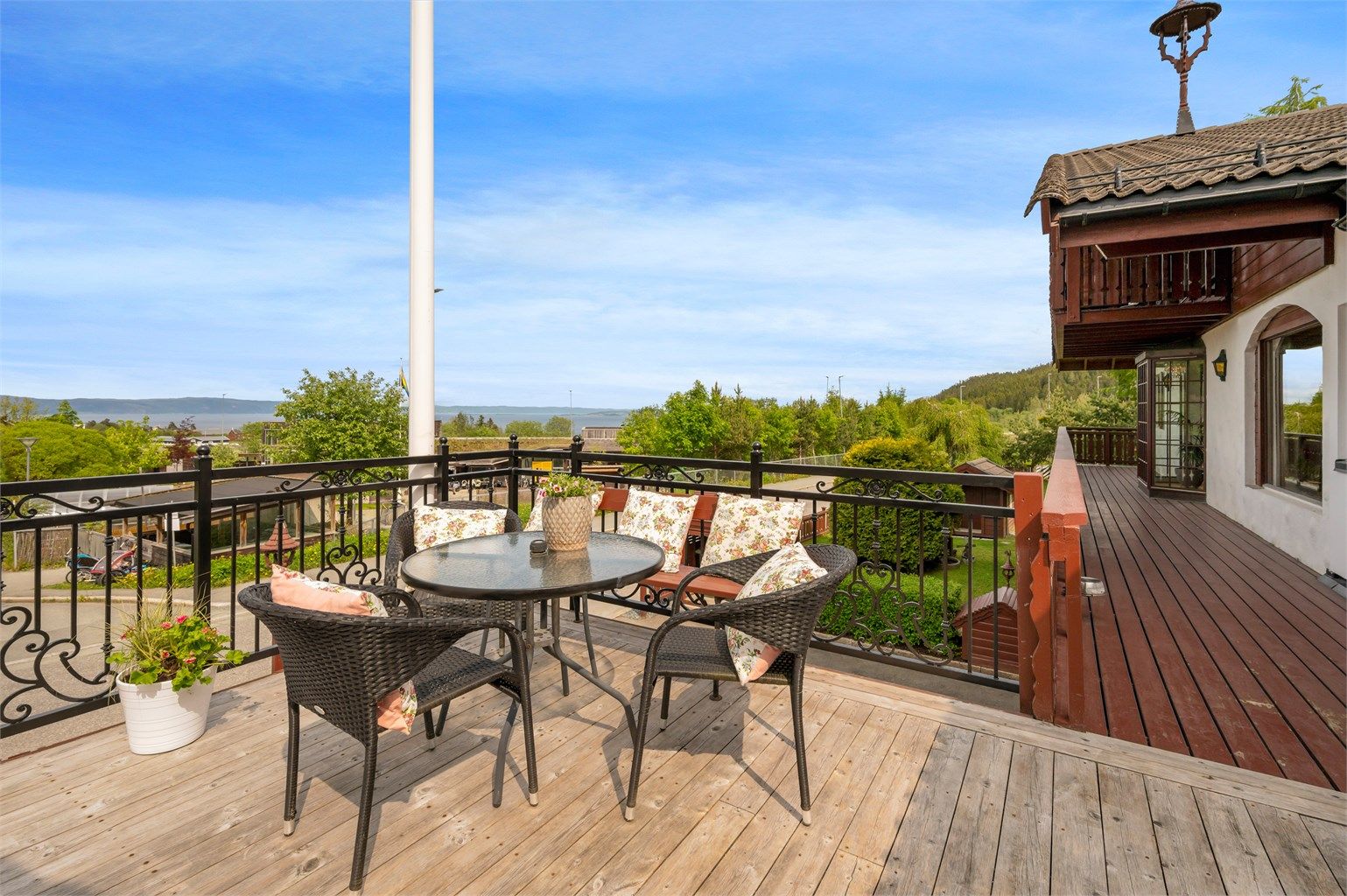 Boligen er helt unik i sin form, med utspring i herskapelig tyrolerstil. Arealet fordeler seg på to store plan samt loftsetasje og tårnstue, og alle rom har stil, karakter og et meget gjennomført særpreg. I tillegg til det store oppholdsarealet rommer underetasjen garasjeareal på hele 150 kvm. Samme etasje har også en lys og fin hybel, godt egnet for utleie. Til sammen gir dette boligen et stort antall bruks- og variasjonsmuligheter, og alle detaljer både inne og ute er en fryd å vandre igjennom.