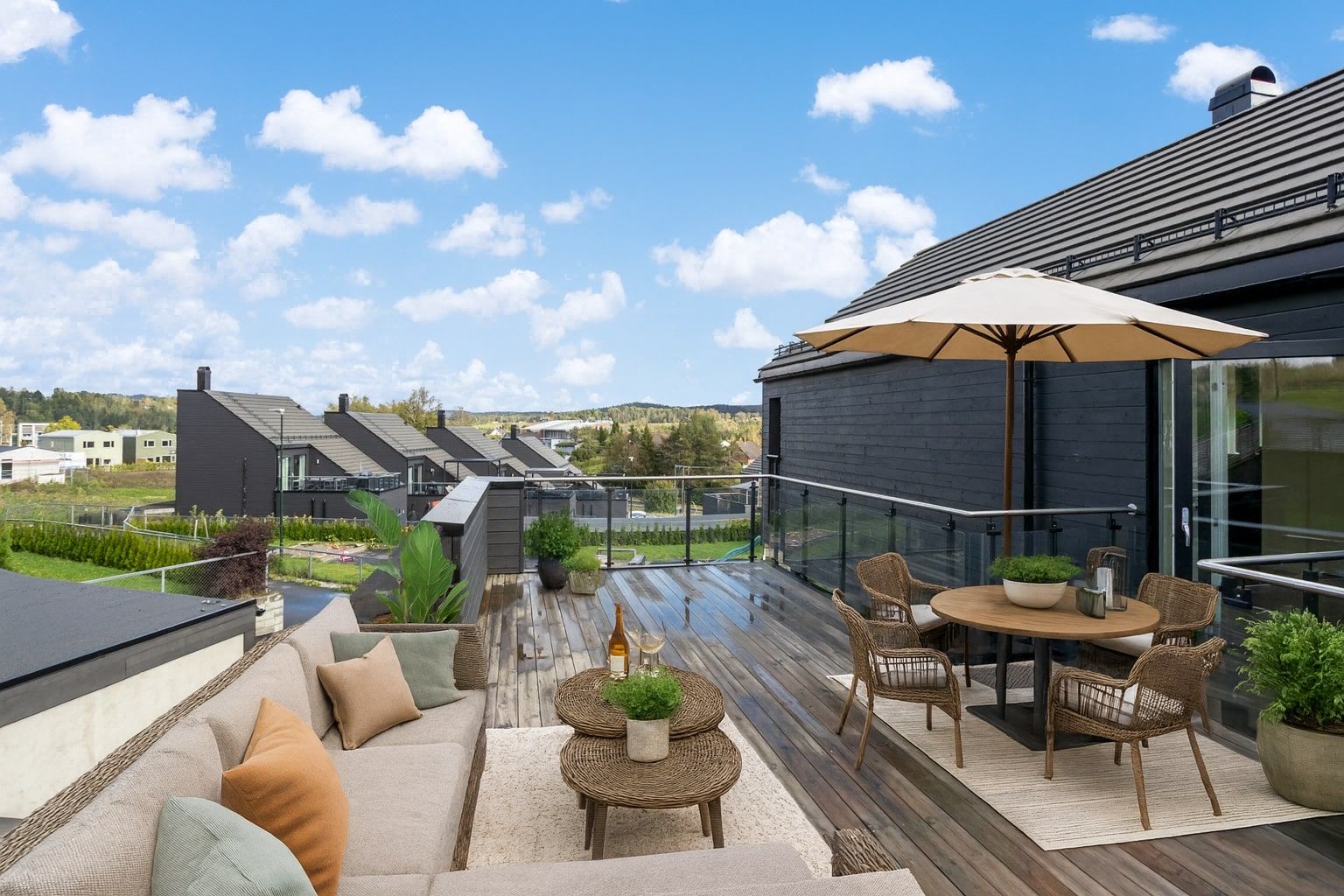 - Stor takterrasse over carport/bod med utgang fra kjøkkenet. Her er det plass til hele familien. Meget gode solforhold. I tillegg balkong med utgang fra stuen og uteplass med utgang via skyvedør ved kjøkkenet.