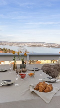 På takterrasse får du følelse av å være "på taket" av Tangenåsen. Formidabel utsikt "fra Fornebu til Svartskog" fra takterrassen. Åpen utsikt fra stue mot Oslo. Utsikt mot Oslo fra vinduer i kjellerstue, fra badevindu og på nordvendt soverom i 2.etg (vindu og balkongdør mot takterrasse). Stor, utbygd endeleilighet med mulighet for ekstra soverom/bruksrom/kjellerstue på ca. 25 kvm i kjeller. Stor hage med mange muligheter, plen på alle tre sider av huset. Hagen mot naborekke er beplanting med syrinhekk. Egen biloppstillingsplass i tilknytning til hagen, med egen lader.