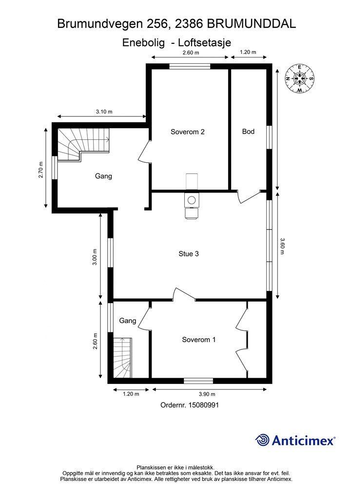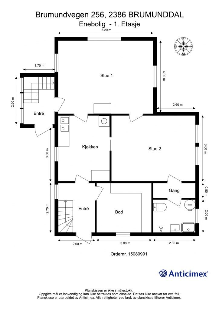 Vedlagte plantegninger er ikke målbare. De oppgitte arealer er hentet fra rapport med befaringsdato 13.04.2026 utført av Anticimex AS v/Marius Rognstad. Arealene er beregnet og rom er definert etter dagens faktiske bruk, uavhengig av hva som er godkjent av bygningsmyndighetene.