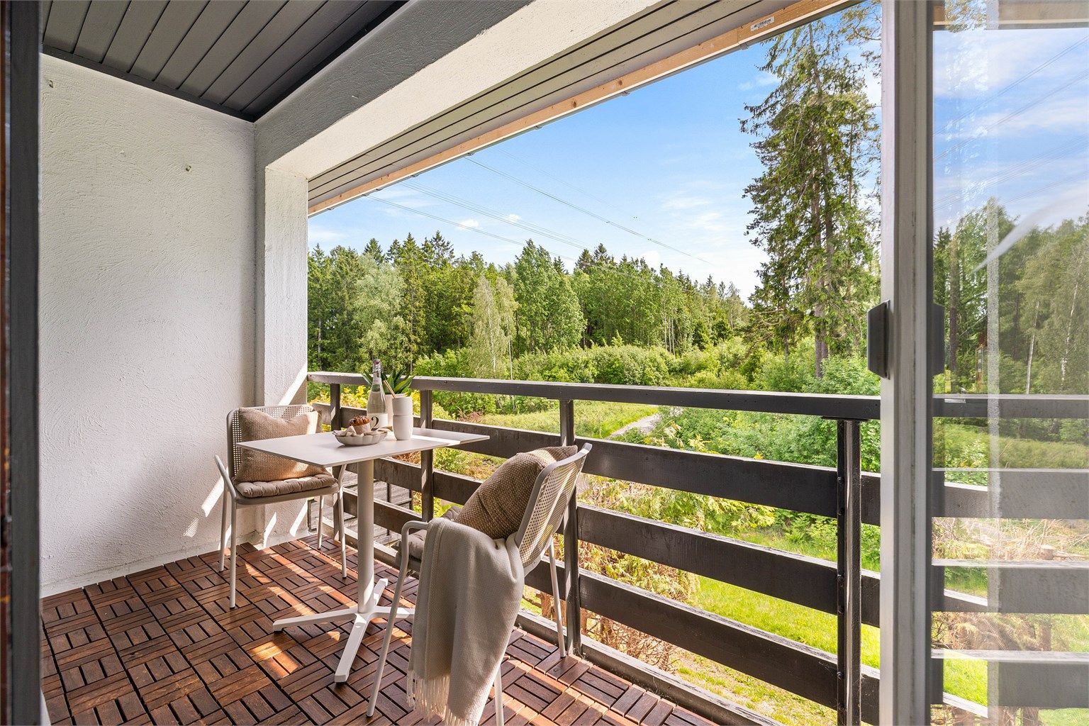 Sydvendt, skjermet balkong med utsyn til skog og mark