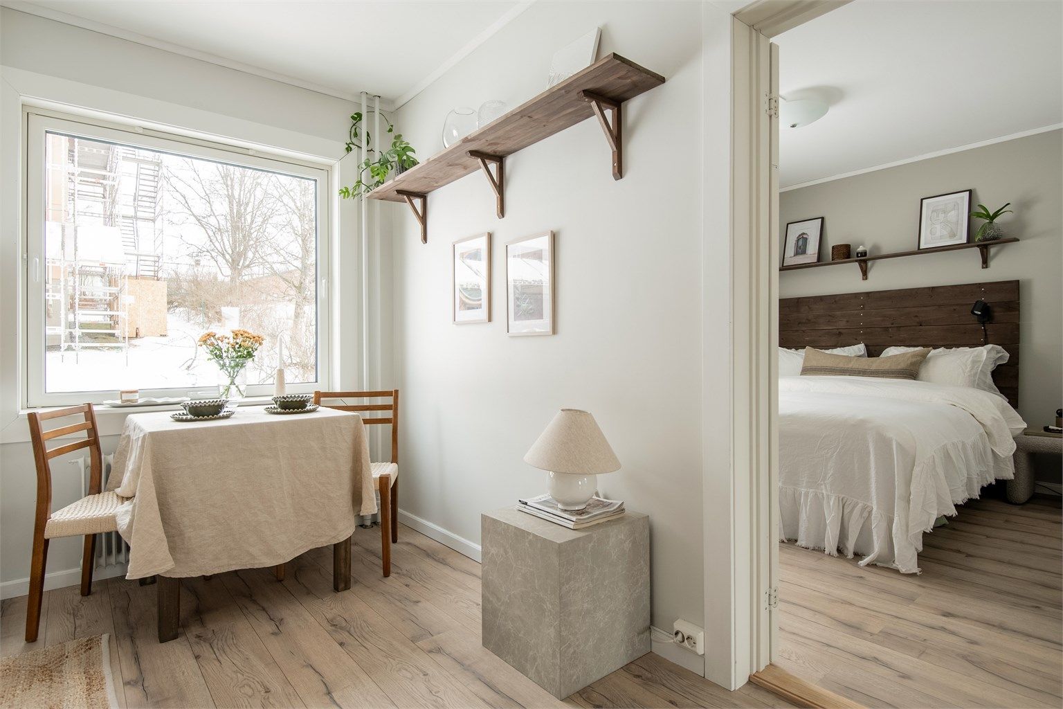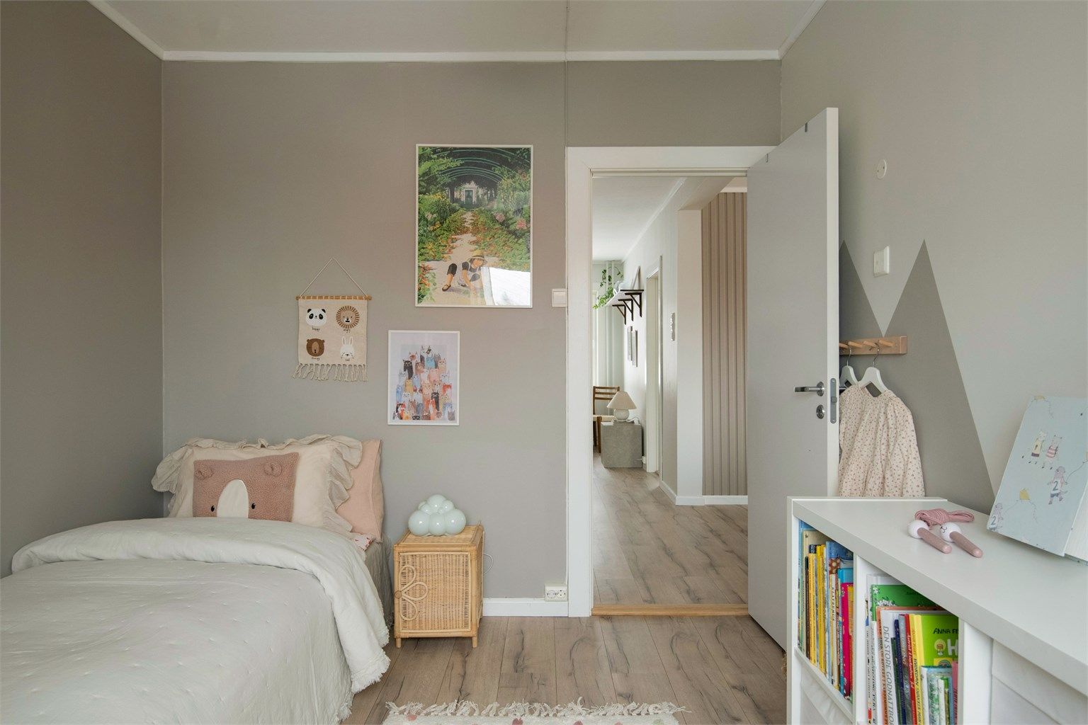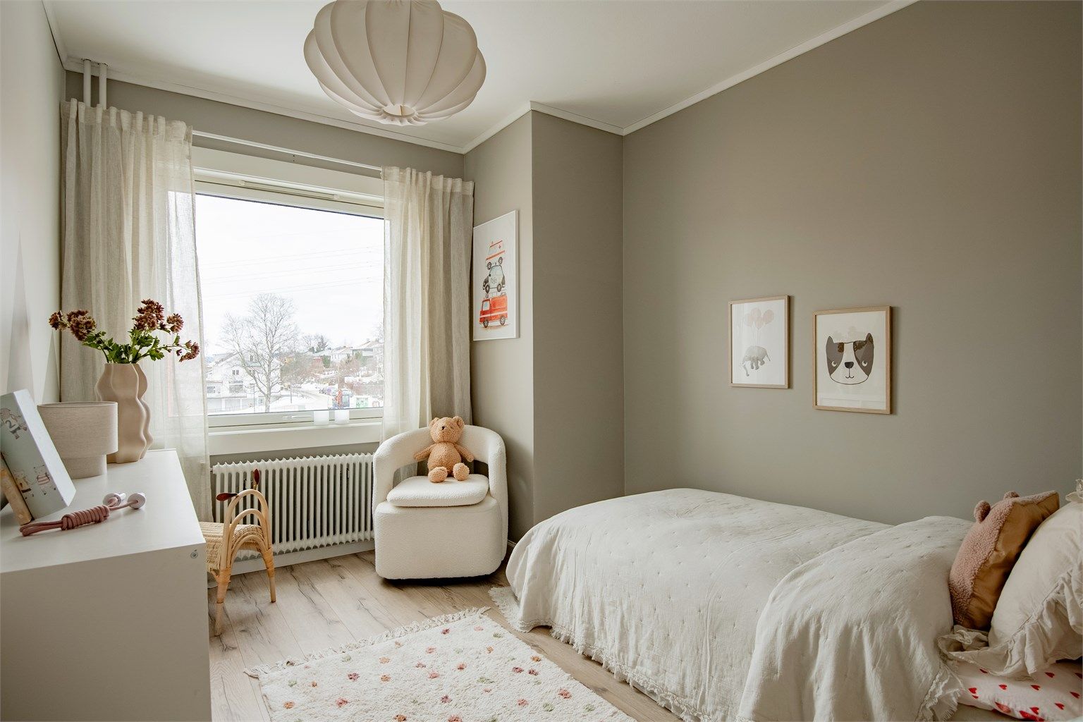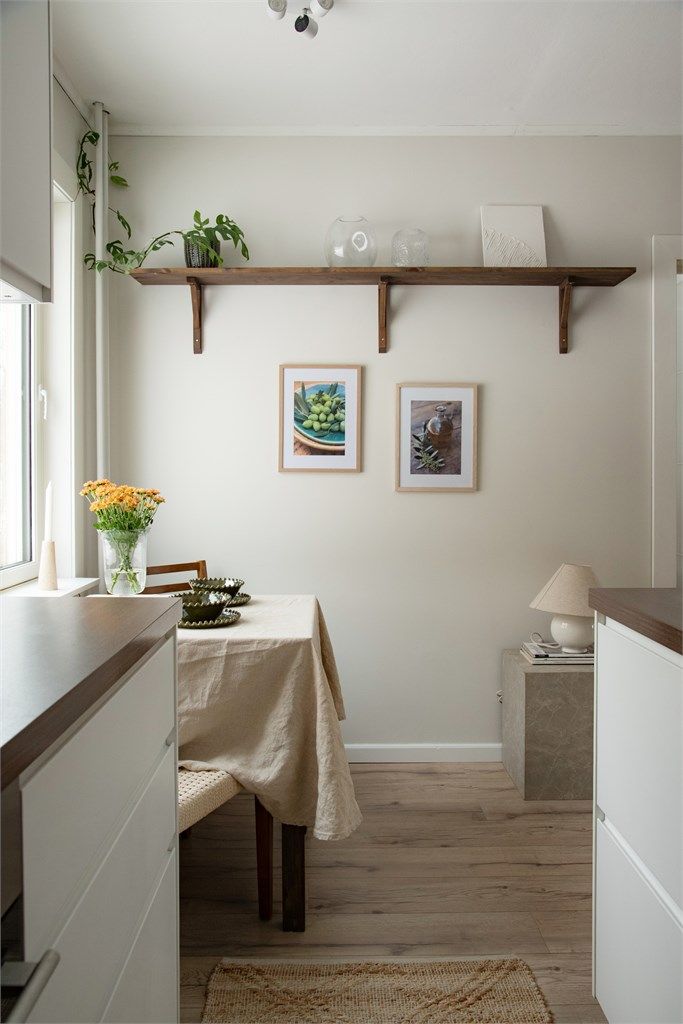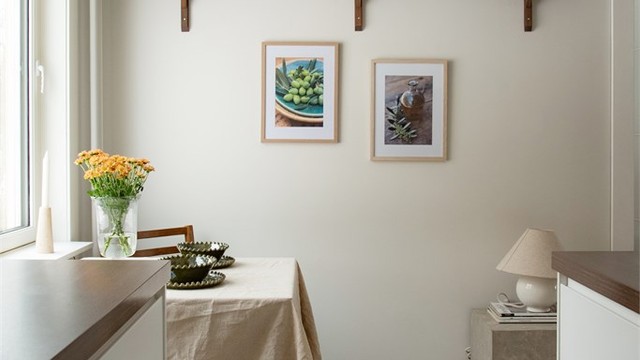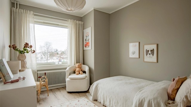 Leiligheten har store vindusflater som slipper inn rikelig med naturlig lys, noe som skaper en åpen og luftig atmosfære. Fargevalget er smakfullt og harmonisk, med rolige nyanser som bidrar til en følelse av ro og komfort.