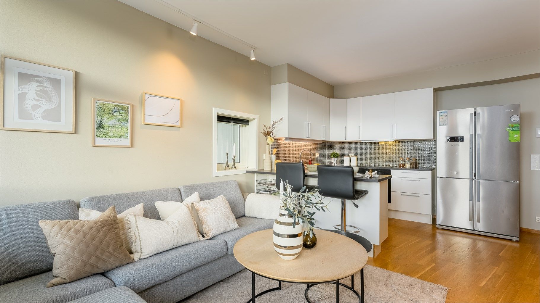 Åpen stue- og kjøkkenløsning med utgang til balkong