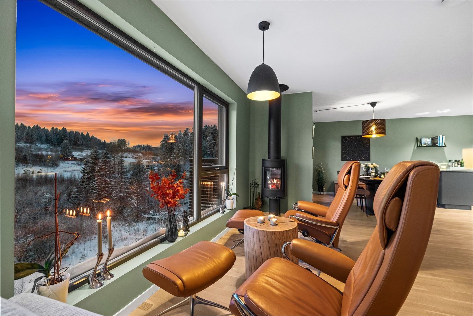 Herlig stue med store vindusflater som gir herlig lysinnslipp og utsyn mot marka. God plass til stor sofagruppe og spisebord med plass til hele familien.