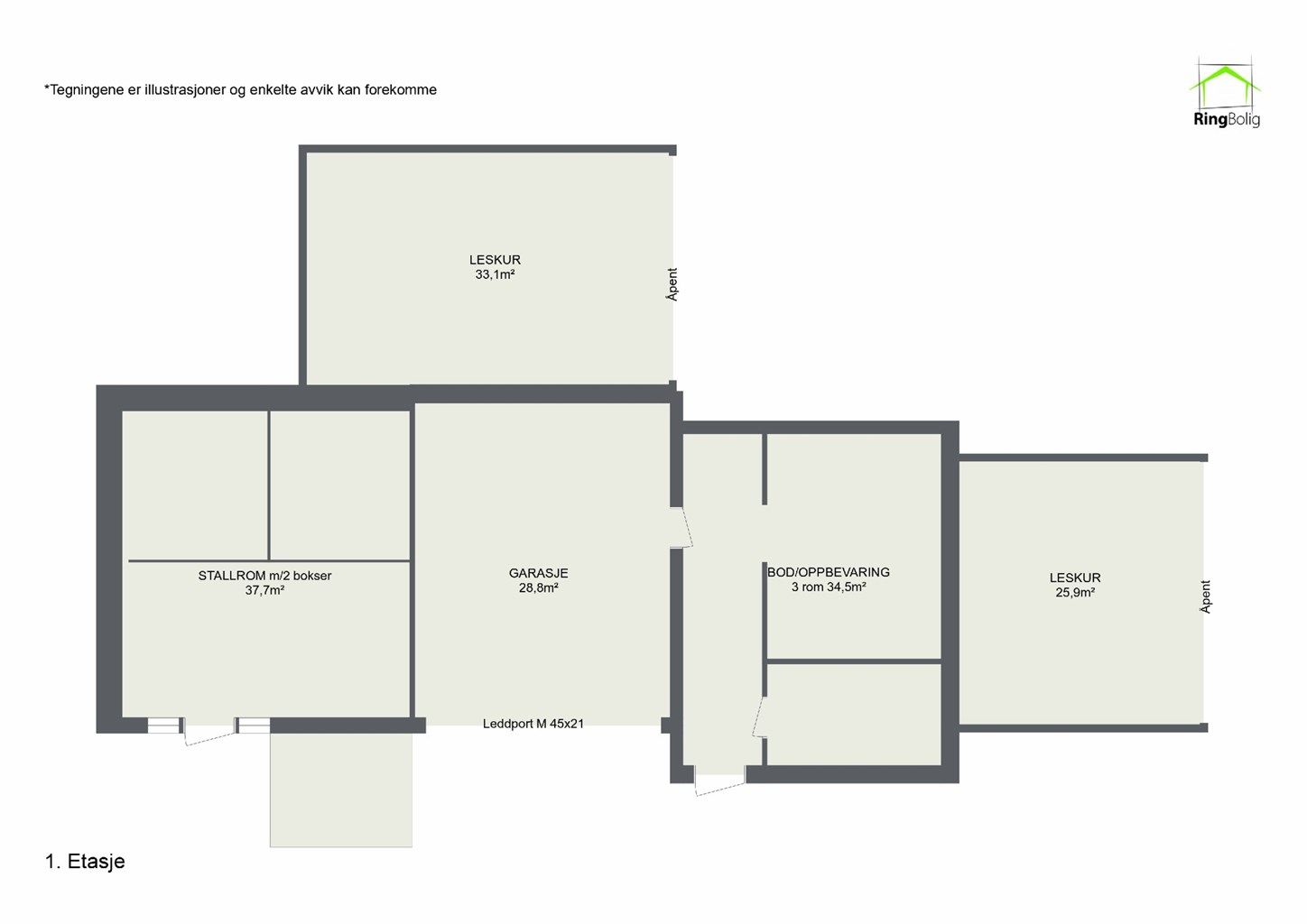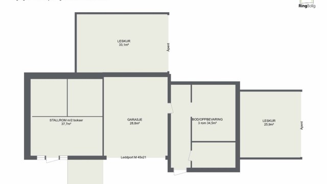 1. etasje 63 kvm: Garasje (28,8 kvm) og boder (34,5).