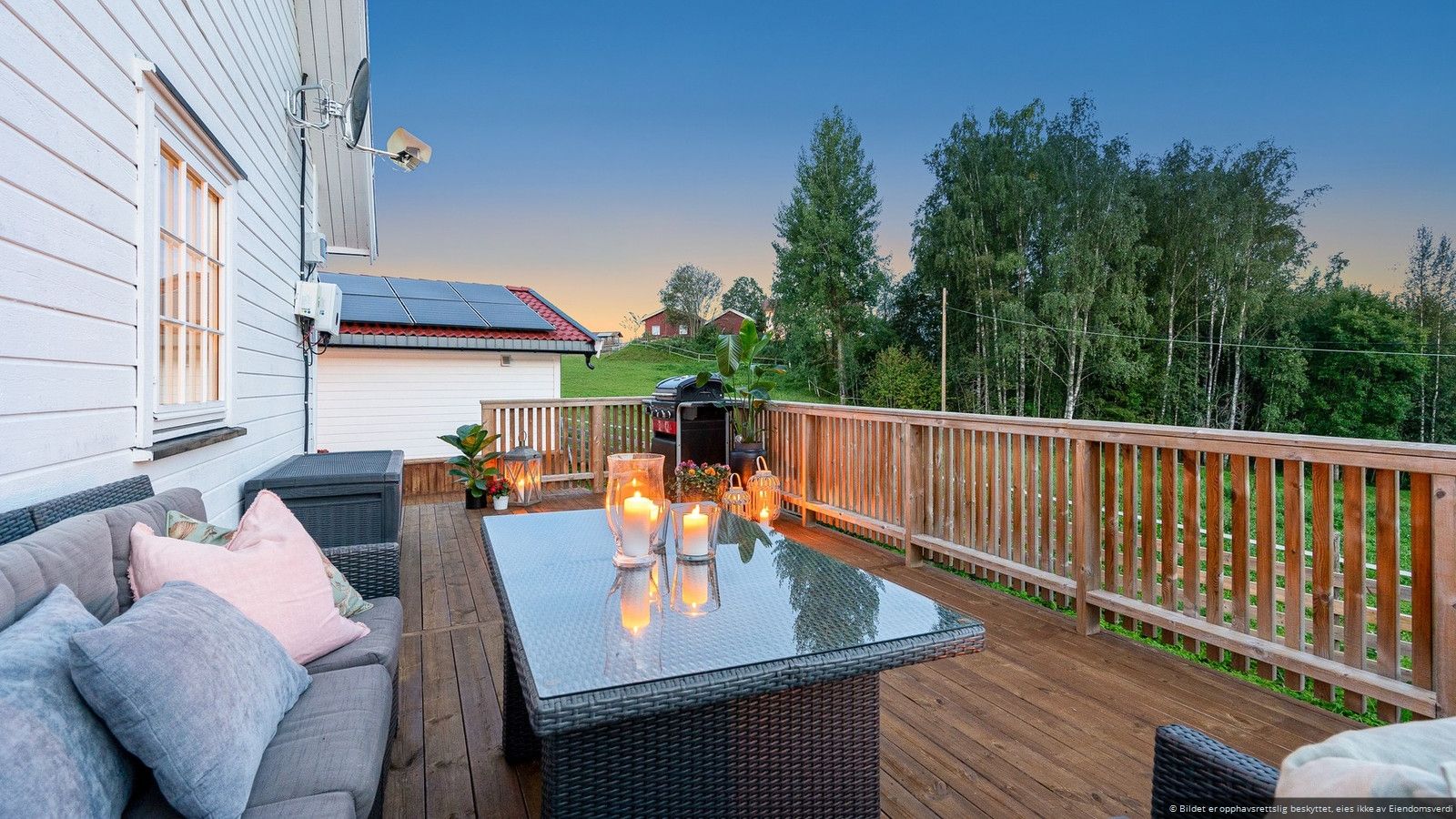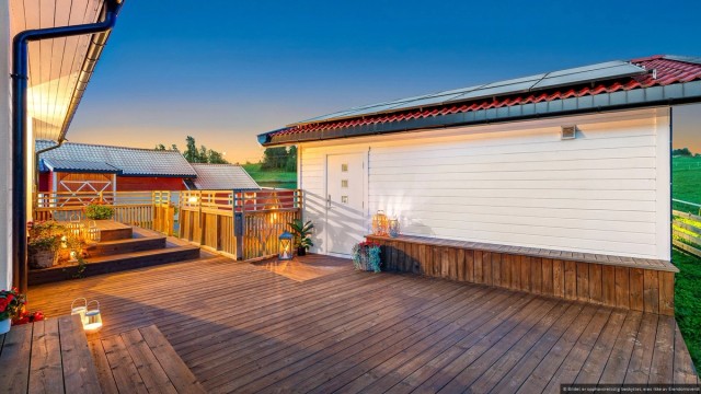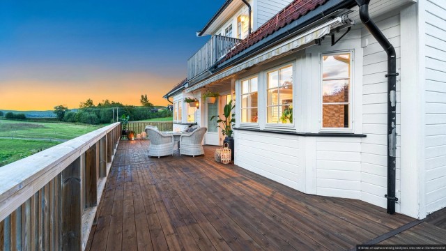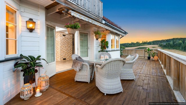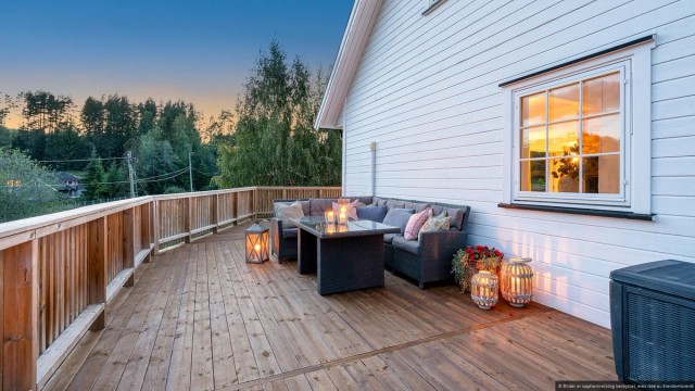 Fra stuen er det utgang til en romslig terrasse på 108 m² som omkranser nesten hele huset, og gjør det lettvint å innta måltidene utendørs store deler av året. Her får du gode solforhold fra formiddag til kveld. Uteplassen innbyr virkelig til utendørs hygge og her er det plass til ønskelig utemøblement, slik at man alltid er beredt for late sommerdager. Uteplassen er utstyrt med elektrisk markise som skaper behagelig skygge og en lun atmosfære.