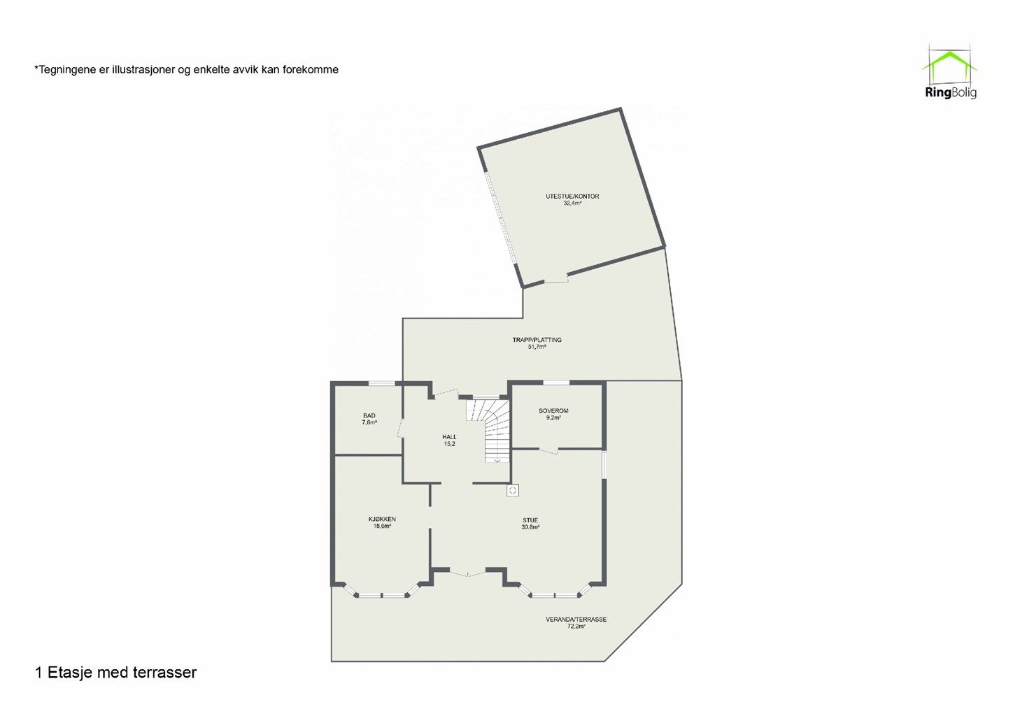 1. etasje 108 kvm: Trapp/Platting (43,kvm) ved hovedinngang. Sydvendt veranda/Terrasse (64,8 kvm) med utgang fra stue.