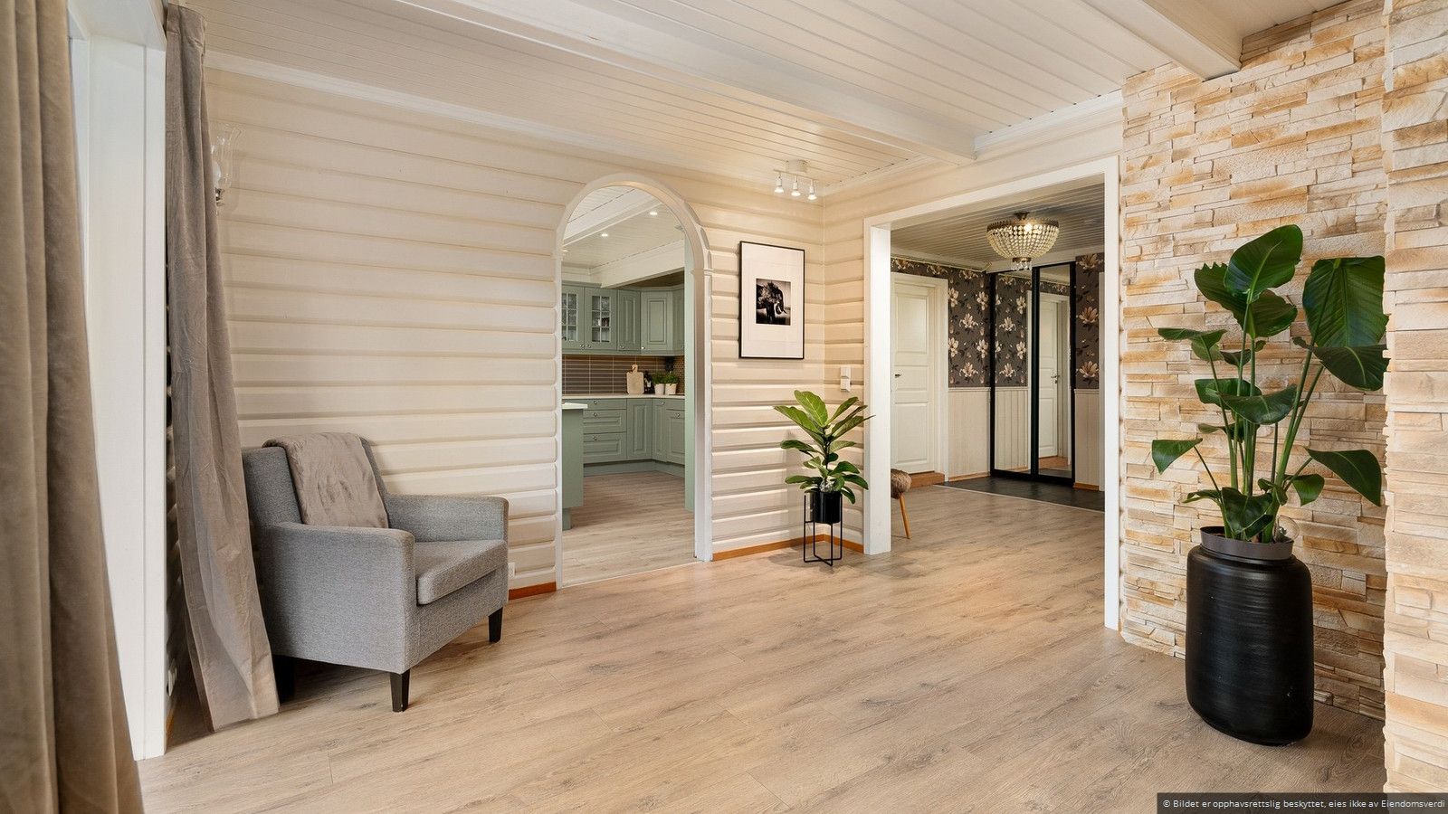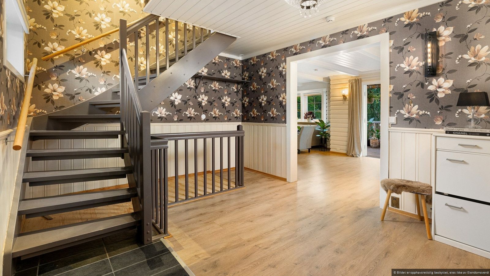 Det luftige og åpne inngangspartiet gir deg en varm velkomst med delikate flater med panel og tapet, samt en praktisk kombinasjon som består av fliser og laminatgulv. Hallen har en god romfølelse, og her ryddes jakker og sko pent bort i skyvedørsgarderoben - her er det også plass til en kommode, som gir ekstra oppbevaringsmuligheter for småting du ønsker å ha lett tilgjengelig. Fra hallen fører en elegant trapp deg både opp til overetasjen og ned til underetasjen, noe som skaper en god flyt mellom etasjene.