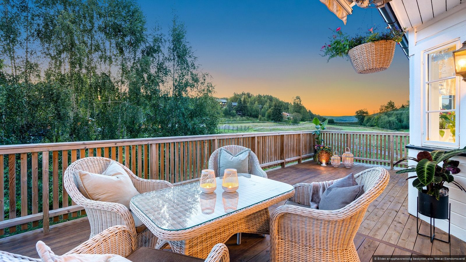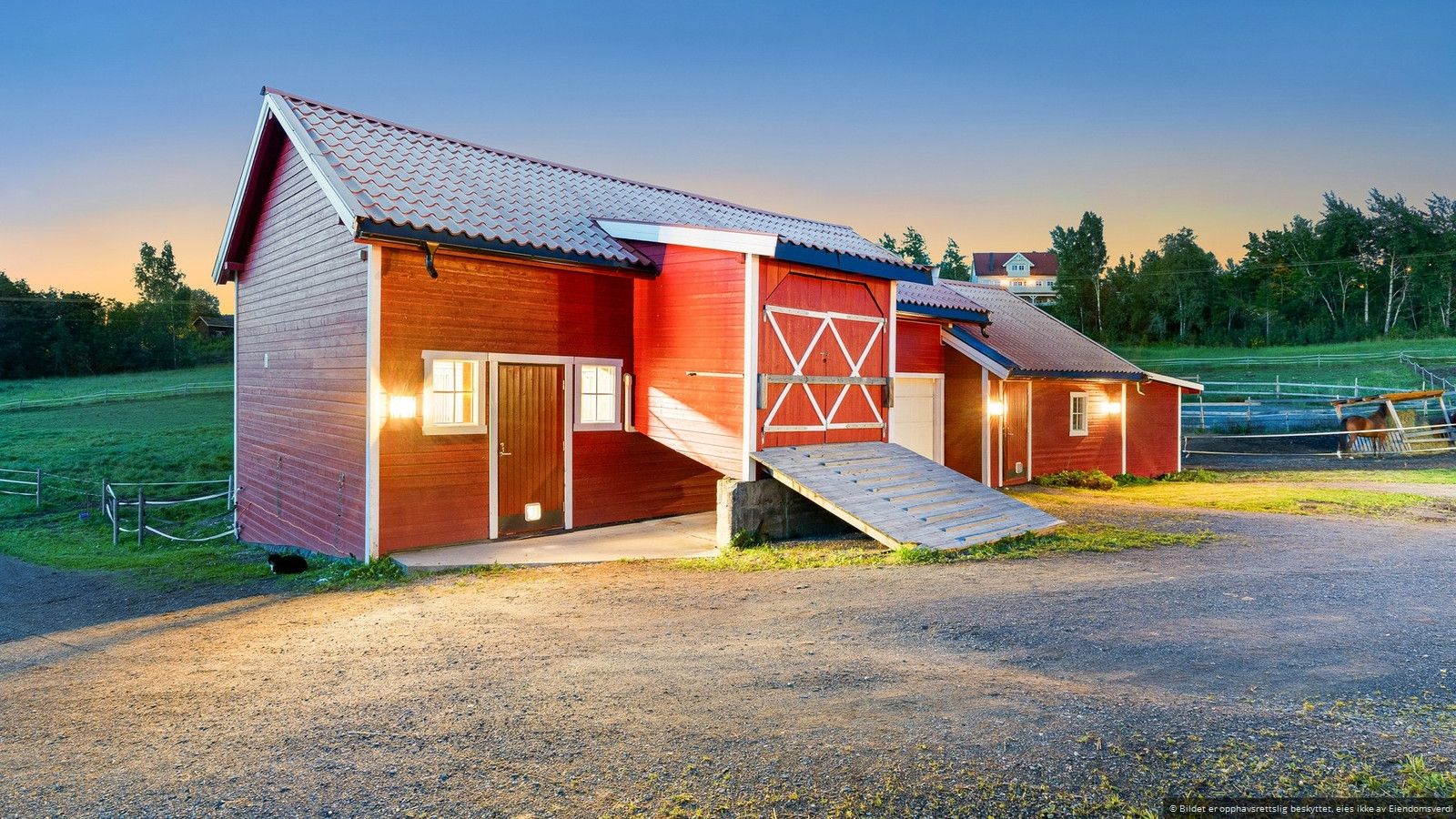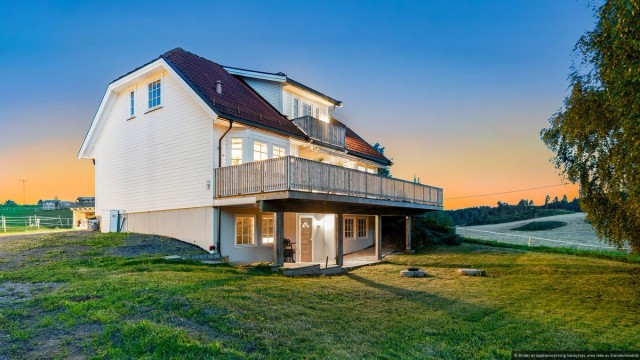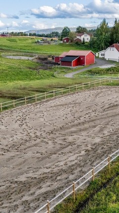 Eiendommen har store beiteområder som gir hestene rikelig med plass på sommerbeite. På toppen av eiendommen ligger en flott, inngjerdet utebane som er perfekt for trening. Her har du alt du trenger for et komplett hestehold på en idyllisk plass, omgitt av naturens skjønnhet og ro.