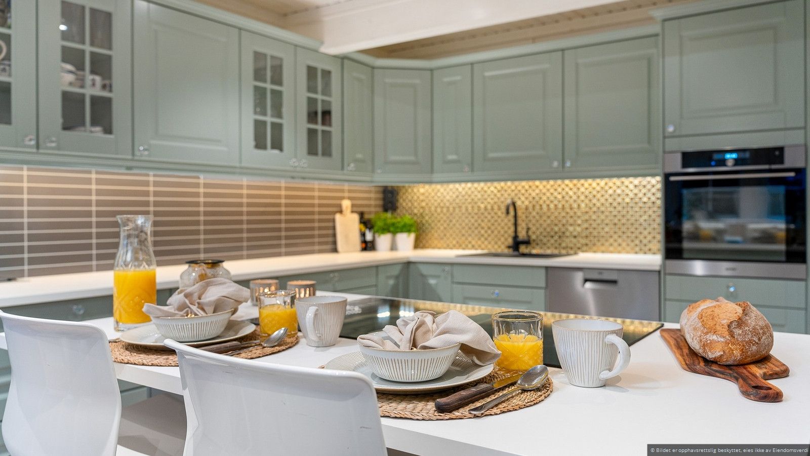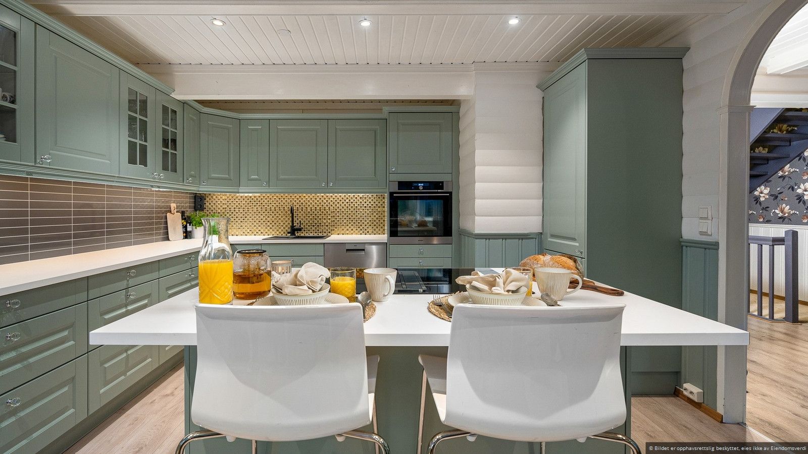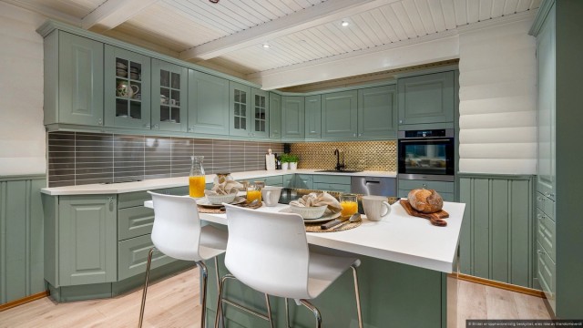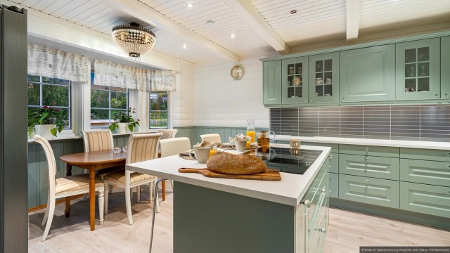 Fra stuen har du direkte tilgang til et innbydende kjøkken hvor innredningen er fra Nybo, installert i 2020. Kjøkkenet er elegant utført med klassiske fronter i en delikat lys grønn farge, og en praktisk kjøkkenøy som gjør matlagingen til en glede. Her er det gode arbeidsforhold med god skap og benkeplass. Det velutstyrte kjøkkenet har integrerte hvitevarer som består av induksjonstopp med integrert ventilator, stekeovn og oppvaskmaskin. I tillegg er det plass til et frokostbord, hvor du kan starte dagen med en rolig frokost i harmoniske omgivelser.
