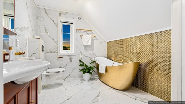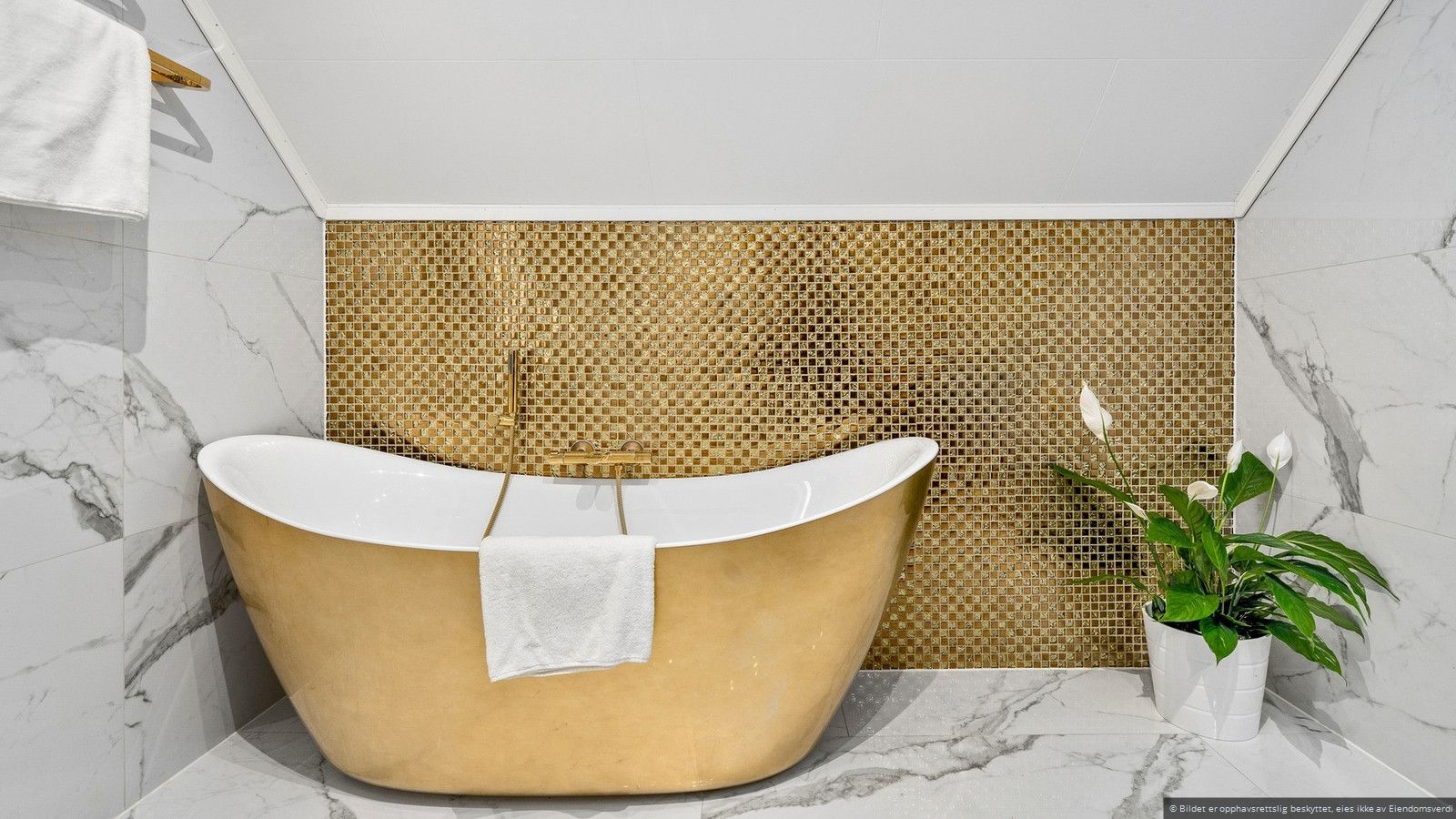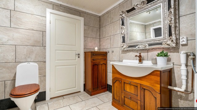 Det praktisk plasserte badet er flislagt og har varmekabler for økt komfort. Badet er innredet i varme og innbydende farger, med en sjarmerende servantskap i tre, et romslig dusjkabinett, samt godt med plass til både vaskemaskin og tørketrommel, noe som gjør dette til et funksjonelt og innbydende rom i boligen.
