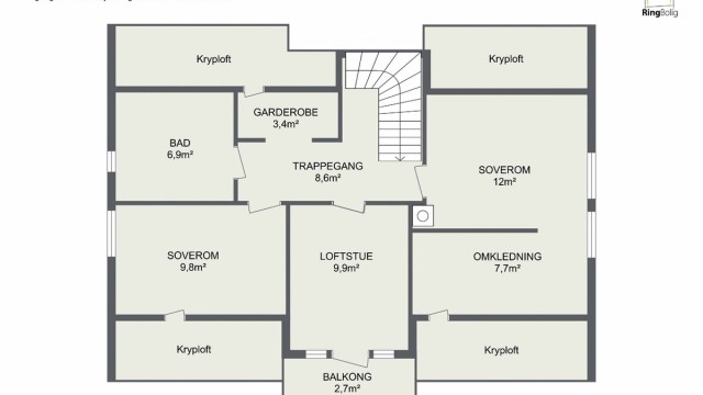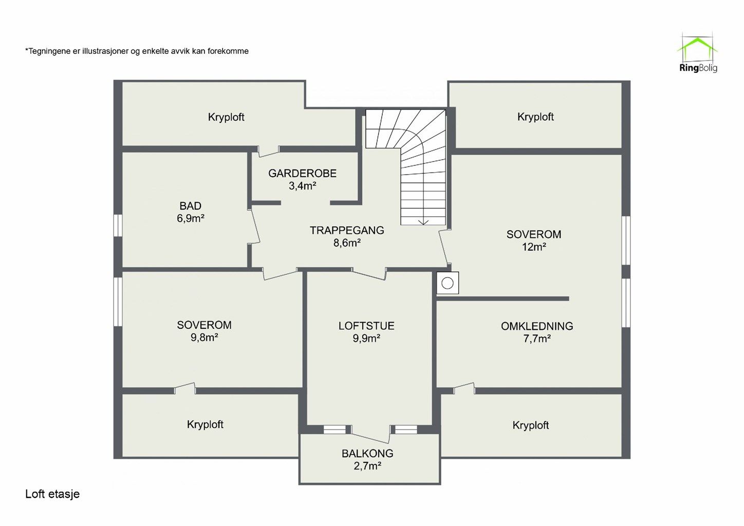 2. etasje 60 kvm: Trappegang, garderobe, bad, soverom, loftsstue, soverom med omkledning.