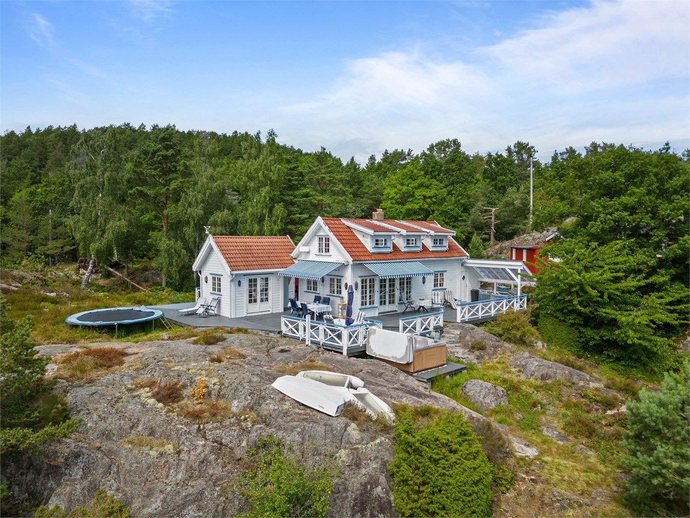 Eiendommen byr på et hovedhus, anneks, frittstående bod, store terrasser på over 100kvm, egen strandlinje og ny dypvannsbrygge på ca 27kvm.