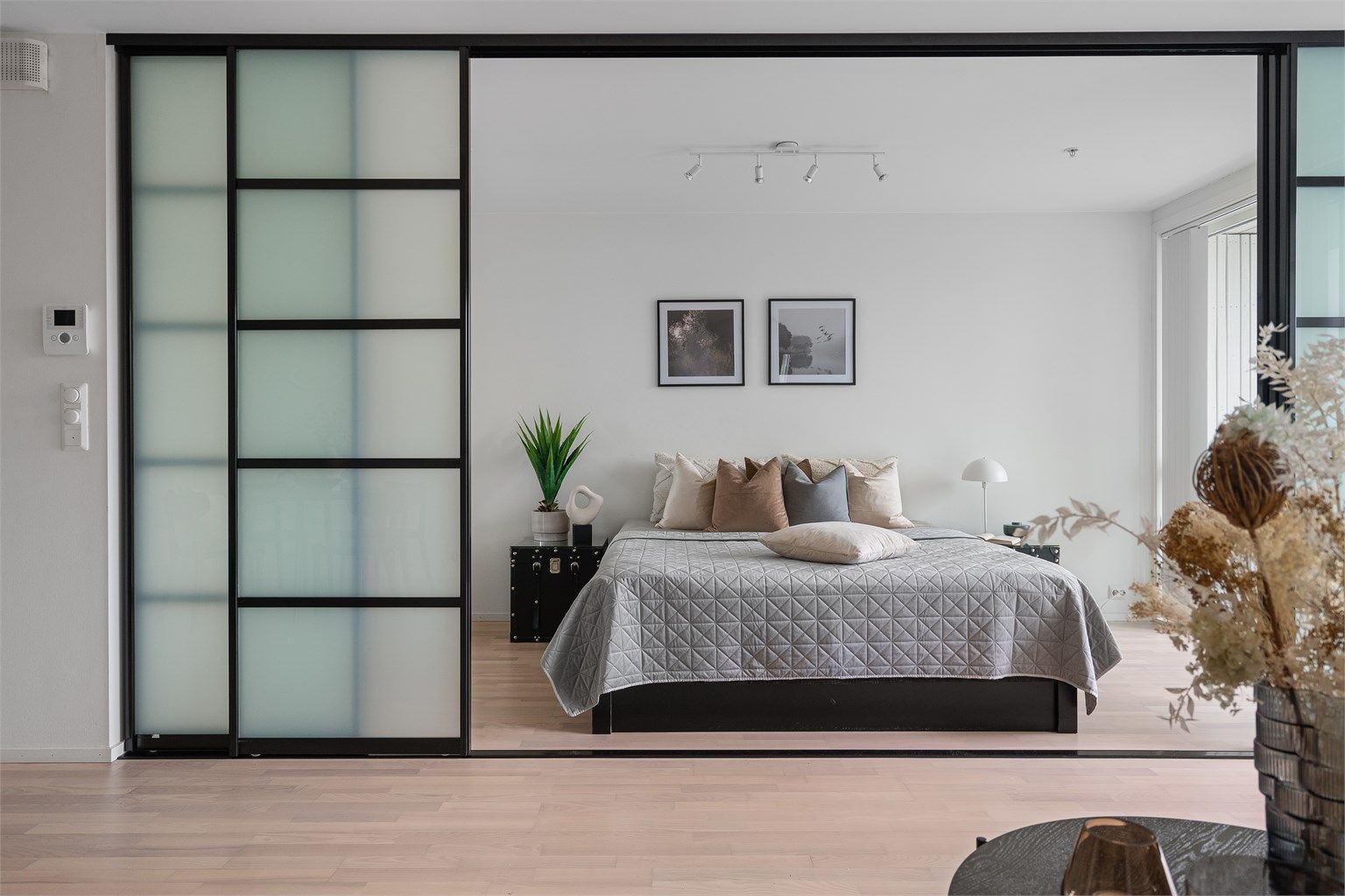 Romslig soverom med plass til dobbeltsenger, nattbord, skap.