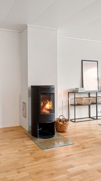Peisovn med glassdør i stue.