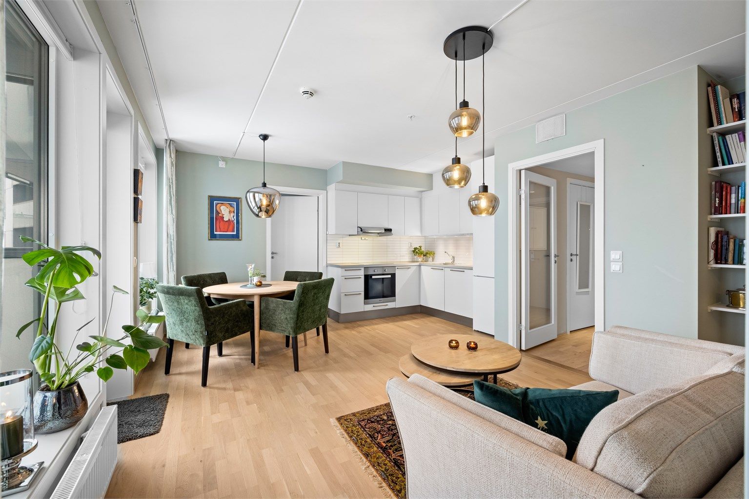Dette er en arealeffektiv og moderne 3-roms leilighet fra 2017. Planløsningen er praktisk med en åpen stue- og kjøkkenløsning, med utgang til en romslig, overbygget balkong.
