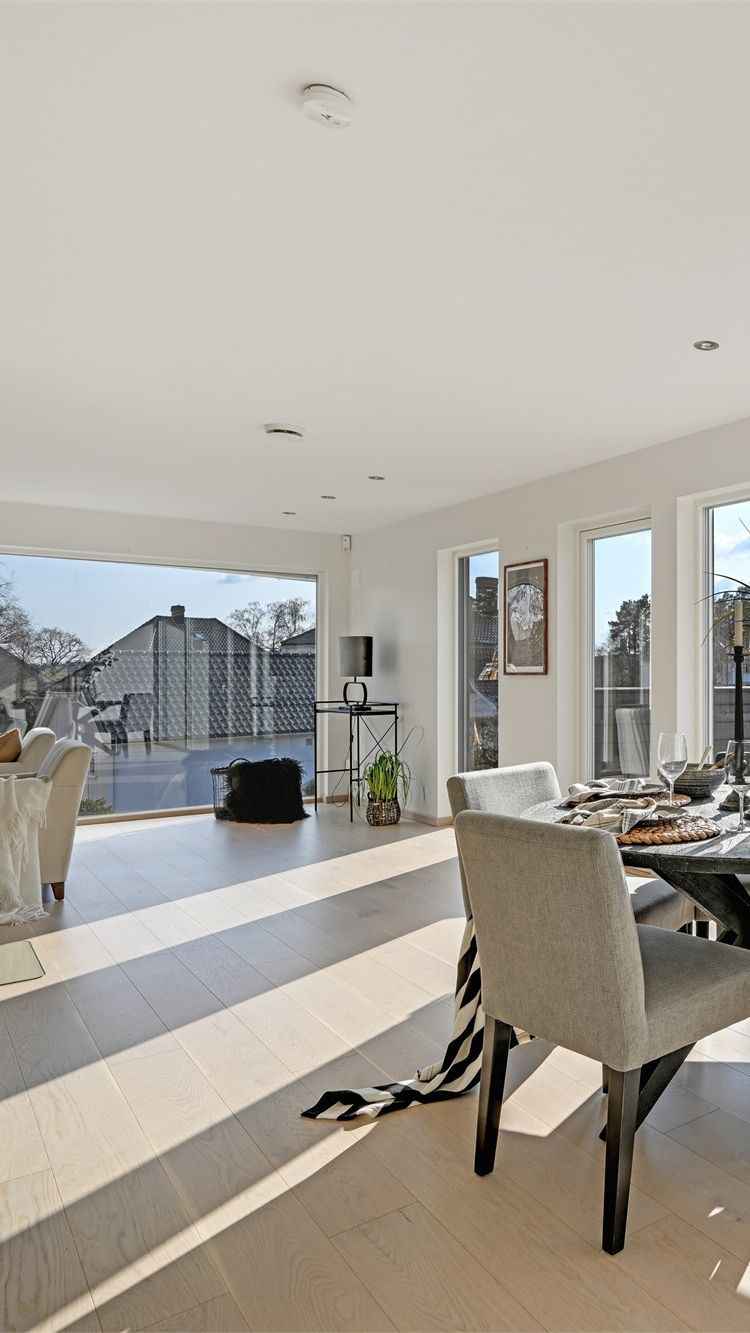 Boligen har gjennomgående moderne og tidløse overflater med parkett og fliser på gulv, samt malte plater på vegger og i himlinger.