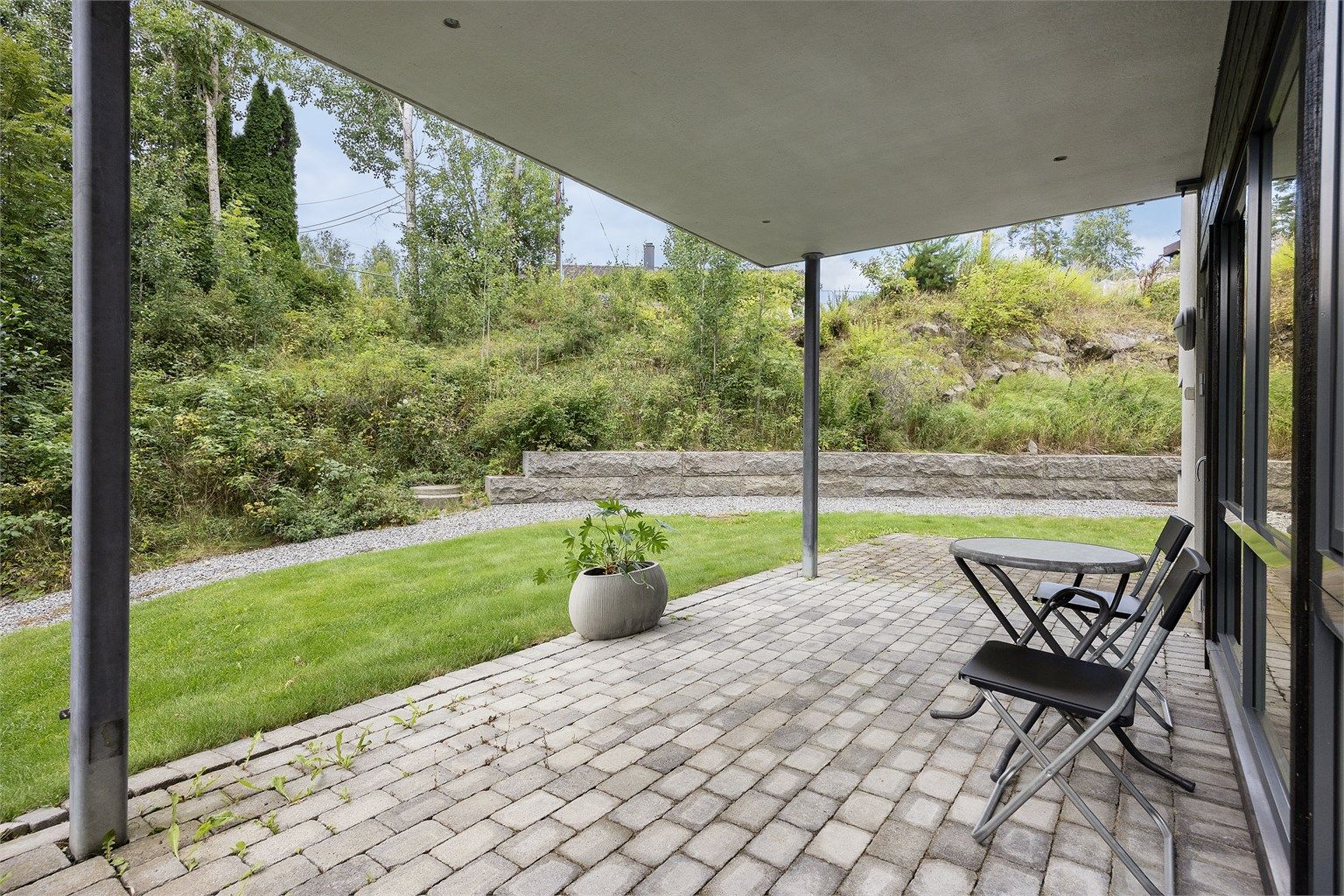Vestvendt markterrasse på stuesiden (22 kvm) og nordvendt markterrasse med egen utgang fra hovedsoverom (7 kvm)