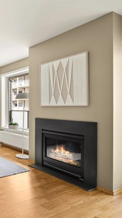 Balansert ventilasjon i leiligheten. Gasspeisinnsats i stue. Radiatorer med fjernvarme i stue/kjøkken og på soverom. Gulvvarme på bad.