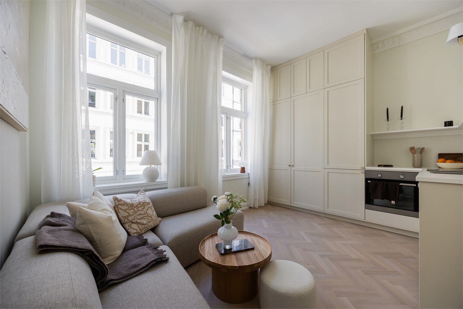 En super smart 1-roms leilighet med sentral beliggenhet i rolig sidegate i Oslo Sentrum. God takhøyde og smart planløsning. Leiligheten er vesentlig oppgradert i 2025. Praktisk skapseng og gode lagringsmuligheter.