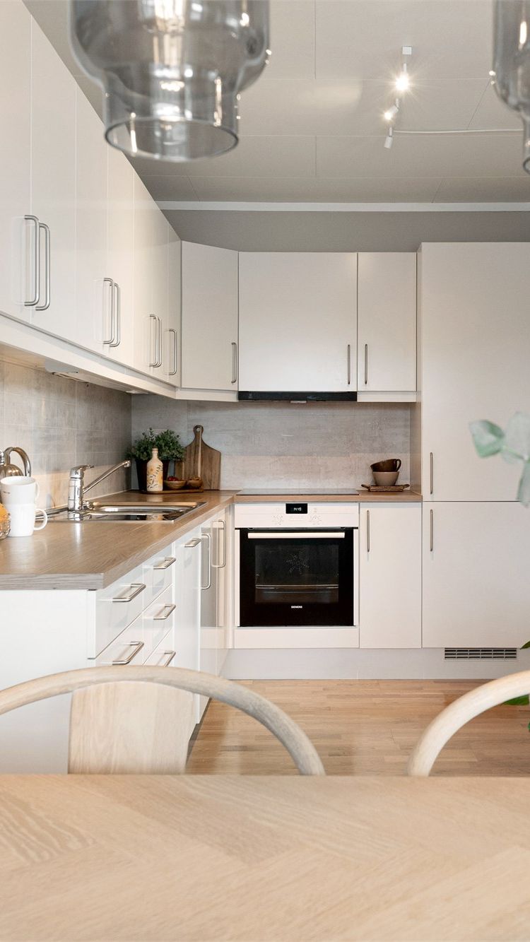 Sigdal kjøkkeninnredning med glatte fronter og benkeplate med laminert overflate med nedfelt kjøkkenvask med armatur. Det er benkeskapsbelysning og stikkontakter over kjøkkenbenk. Integrert stekeovn, platetopp, oppvaskmaskin og kjøleskap med fryser. Det er ventilator i overskap med komfyrvakt. Laminert flisplate mellom kjøkkenbenk og overskap.