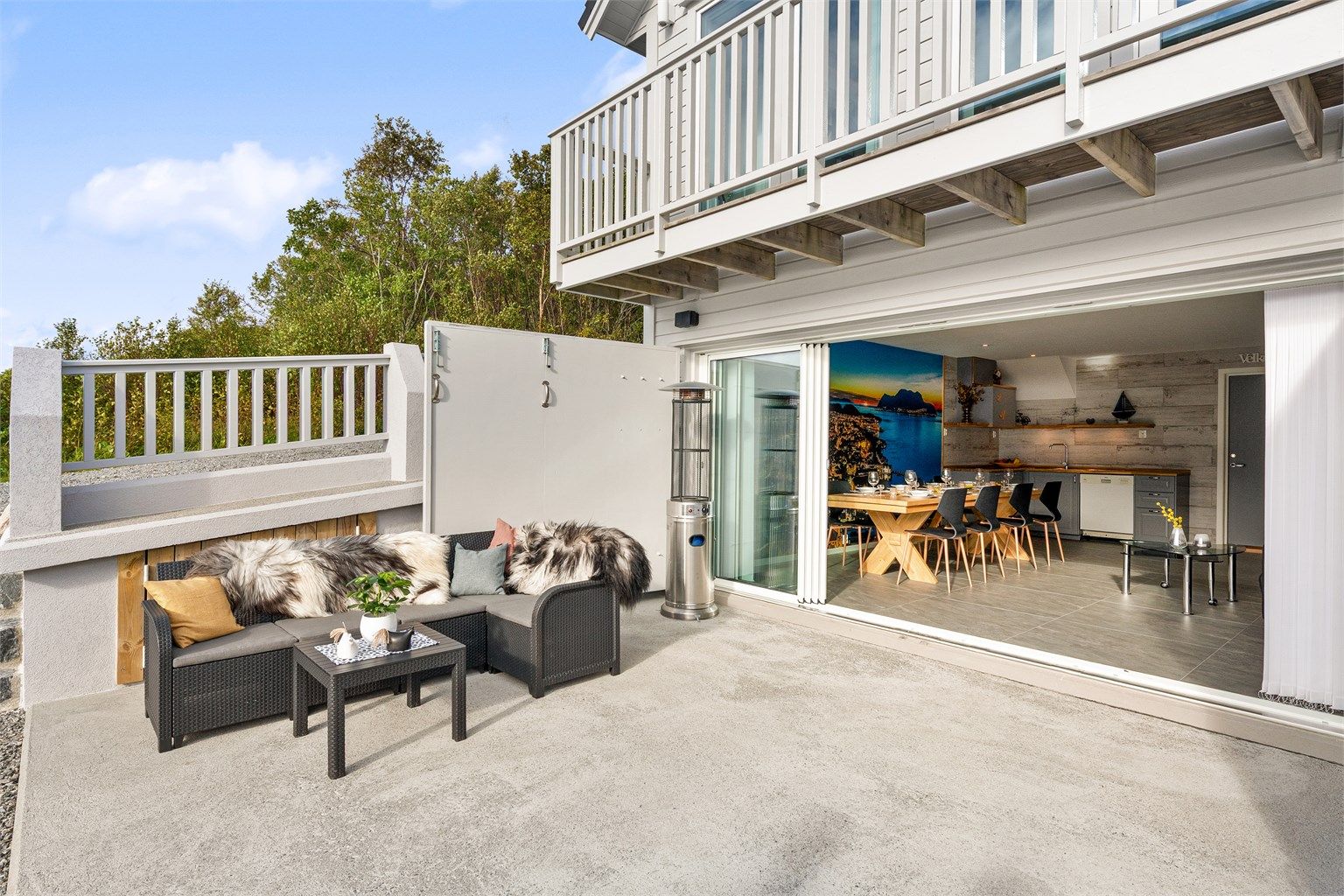 Stor og luftig naustrom med fliser på gulv med gulvvarme, malte vegger samt en flott vegg med fototapet over Ålesund by. I front av naustet er det store dører i tre og enkle skyvedører i glass som gjør at man sitte lunt i all salgs vær, men likevel nyte den flotte utsikten mot fjorden.