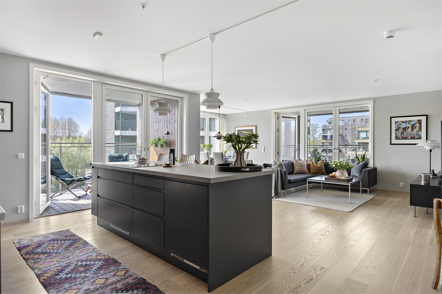 - Utgang fra stue til nordvestvendt balkong på 11 kvm. Utgang fra kjøkken til sørvestvendt balkong på 7 kvm.