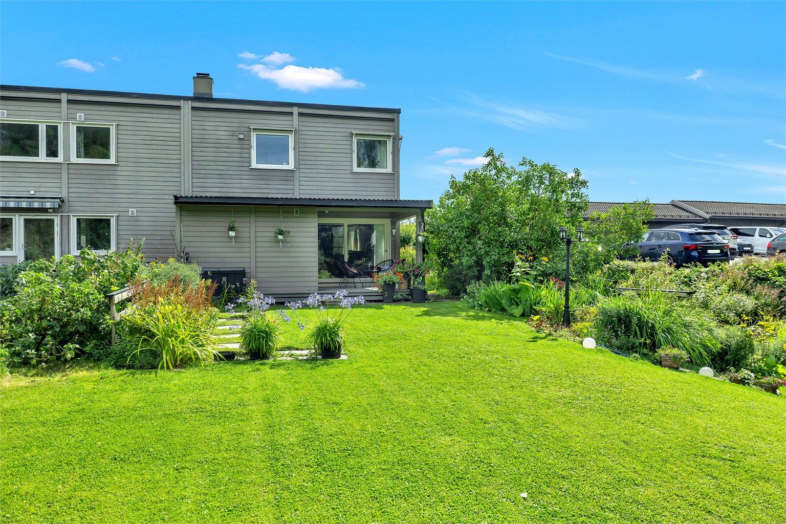 * Solrike uteplasser både foran og bak huset.