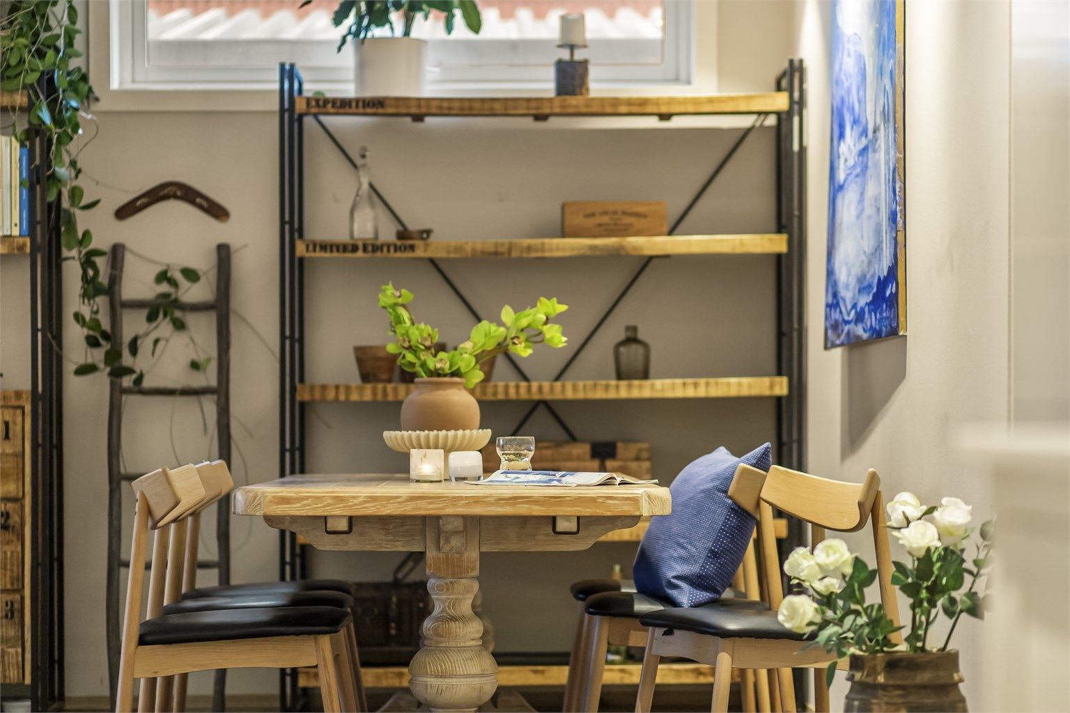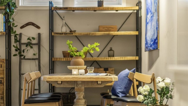 Kjøkkenet ligger tilbaketrukket fra stuen og fremstår lyst og smakfullt, med hvitprofilerte fronter og rikelig med skap- og benkeplass. Kjøkkenet er utstyrt med integrerte hvitevarer som komfyr, platetopp, kaffemaskin, oppvaskmaskin og kjøleskap i full størrelse. Hvitevarene medfølger handelen, men er fra byggeår og slitasje må påregnes. Praktisk integrert strykebrett i skuff. Her er det plass til kjøkkenbord for de daglige måltider, og rommet har en hyggelig atmosfære. Fra kjøkkenet er det utgang til en deilig og sval uteplass – perfekt for morgenkaffen.