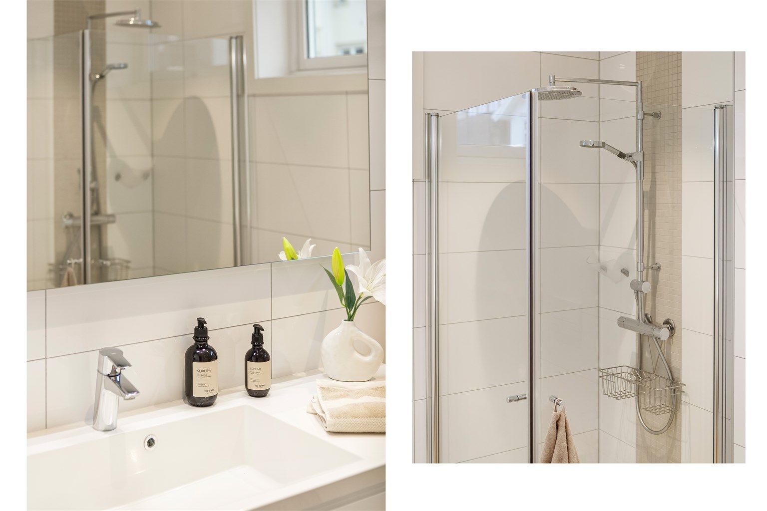 Praktisk er det med to delikate bad, begge flislagt og innredet med downlights i tak og varmekabler i gulv. Hovedbadet er romslig og innredet med dusjhjørne, bidé, vegghengt toalett og servant i innredning. Gjestebadet er også praktisk utformet med dusjhjørne, vegghengt toalett og servant. I tilknytning til gjestebadet er det skyvedør inn til vaskerom – en gjennomtenkt løsning som gir mulighet til å skjerme vaskerommet fra badet når man har gjester. Det er plass til både vaskemaskin og tørketrommel.
