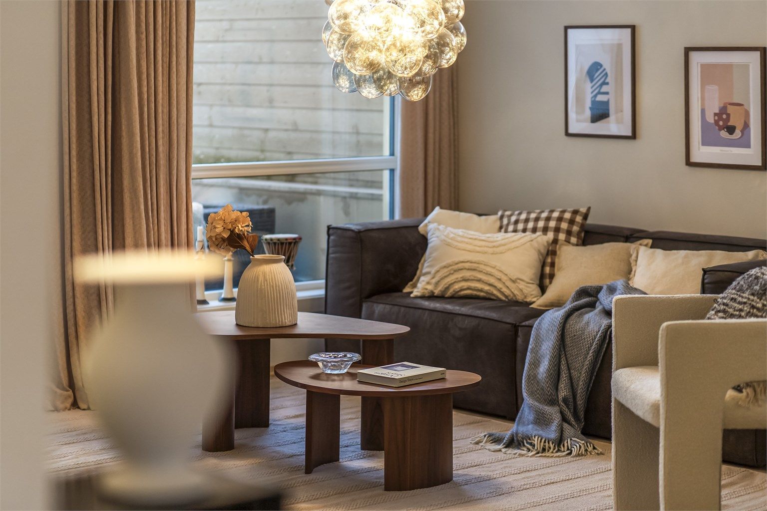 Gardiner og gardinoppheng er skreddersydd til alle vinduene og medfølger handelen. Lysekrone i stuen medfølger også.