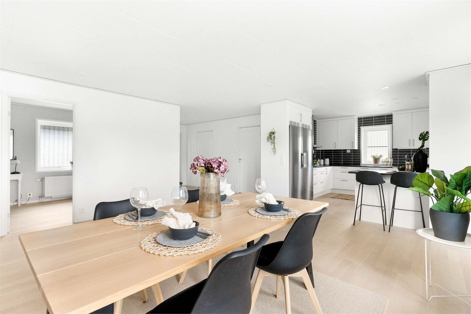 Tove er et generøst og familievennlig vinkelhus på ett plan, perfekt for en stor familie – eller for deg som ønsker fleksibilitet for fremtiden. Huset har hele tre til fem soverom og to bad som standard, samt et romslig walk-in-closet som gir ekstra luksus i hverdagen. Den åpne kjøkken- og stueløsningen gir et sosialt allrom med plass til både familiekos og hyggelige sammenkomster. Den skjermede uteplassen føles som et ekstra rom der du kan nyte lange sommerkvelder og uforstyrret morgenkaffe. Med 5-års nybygg garanti fra utbygger får du et trygt og moderne hjem som enkelt kan tilpasses din livsstil.