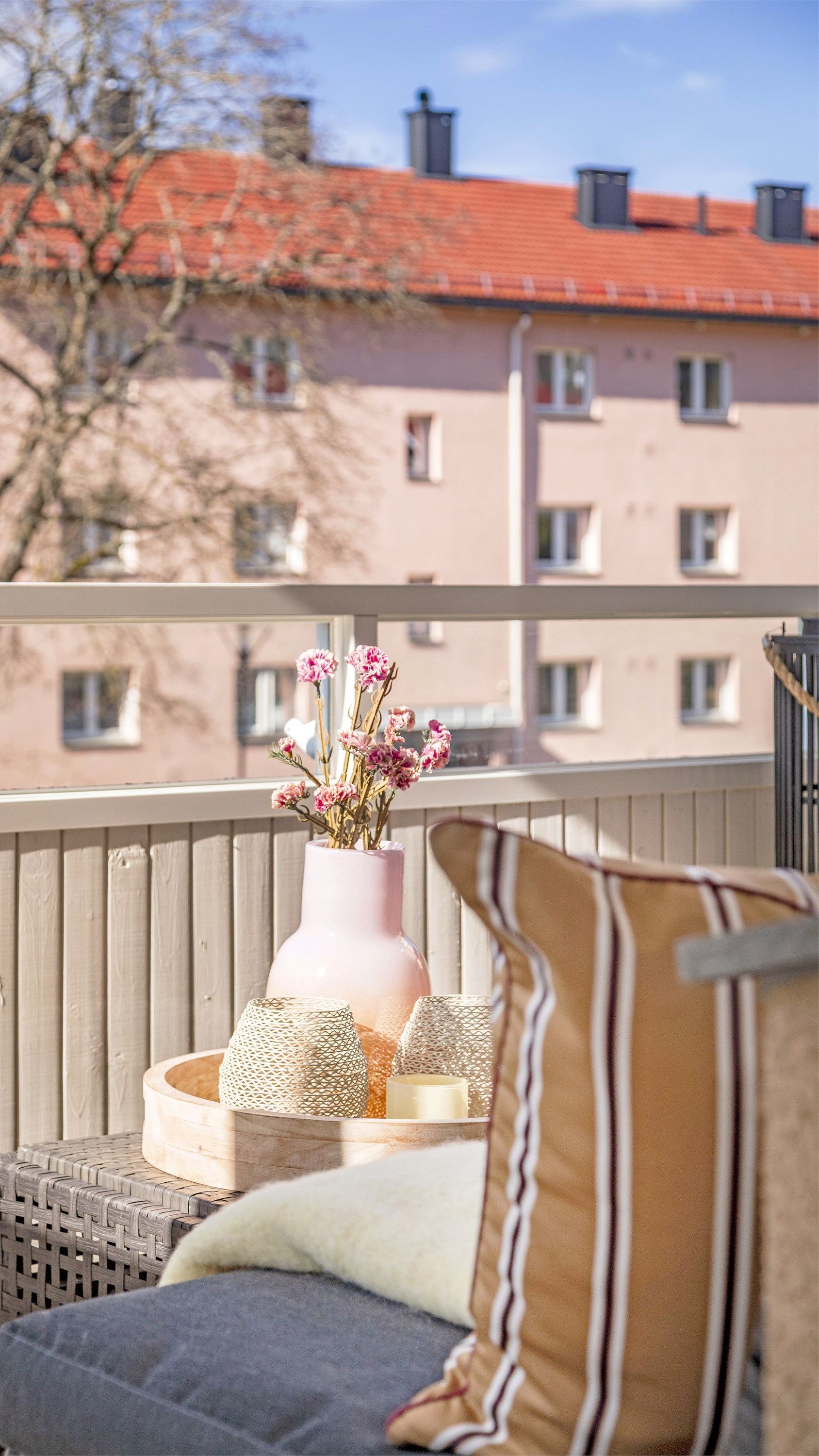 Fin og romslig stue med god plass til sofagruppe og spisestuemøbler. Det er plassert en sjarmerende peisovn i det ene hjørnet som gir ekstra varme til rommet. Stuen har utgang til en koselig vestvendt balkong på ca. 8 kvm. Balkongen er overbygget, noe som forlenger utesesongen med flere uker og det er gode solforhold. Balkongen har også markise.