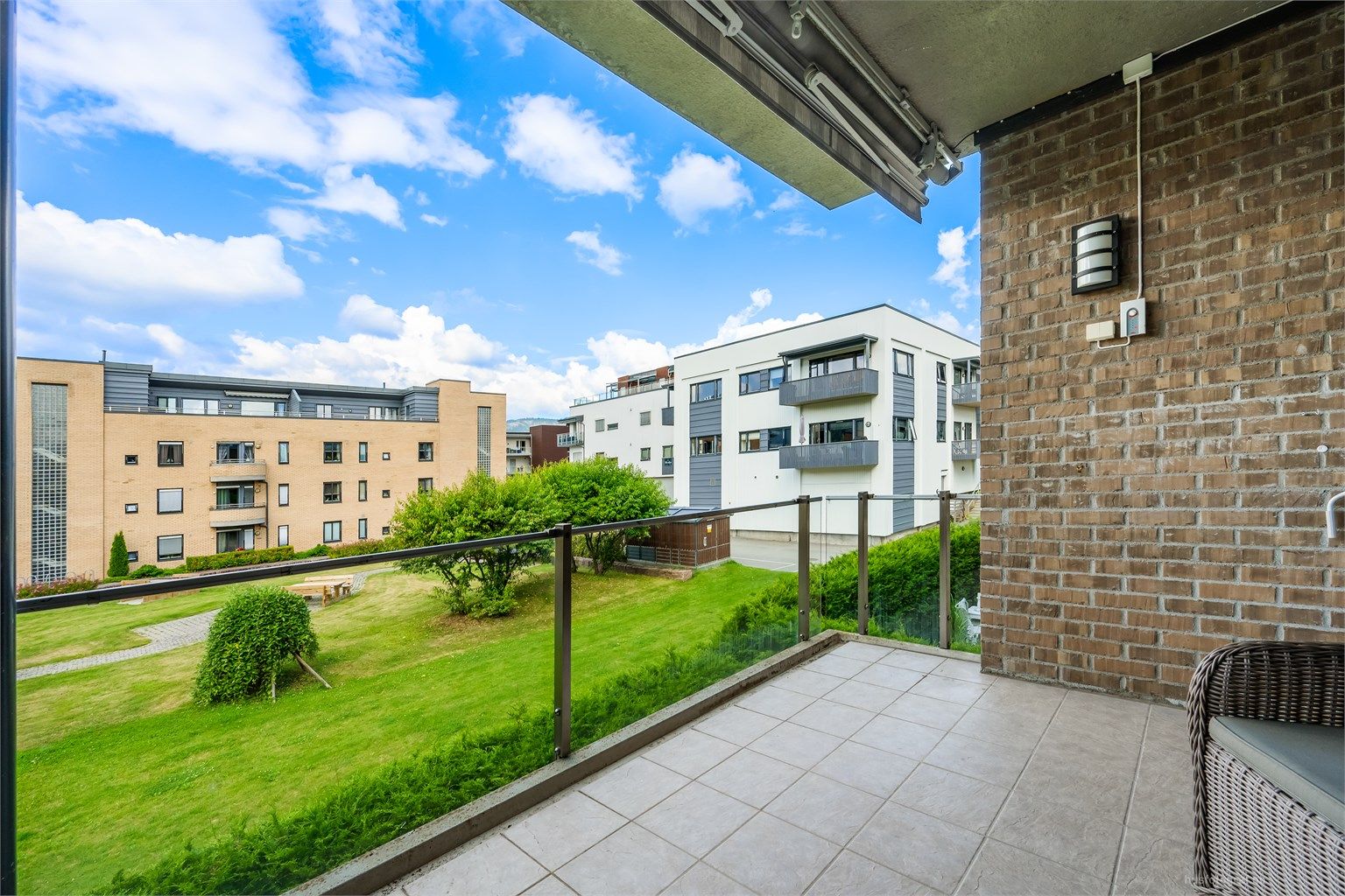 Overbygget sydvestvendt balkong på ca. 11 kvm med fliser og markise