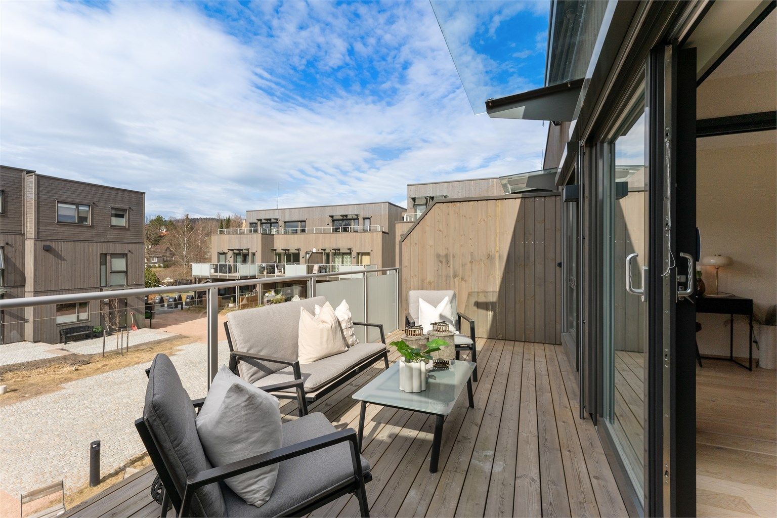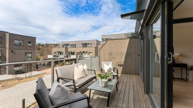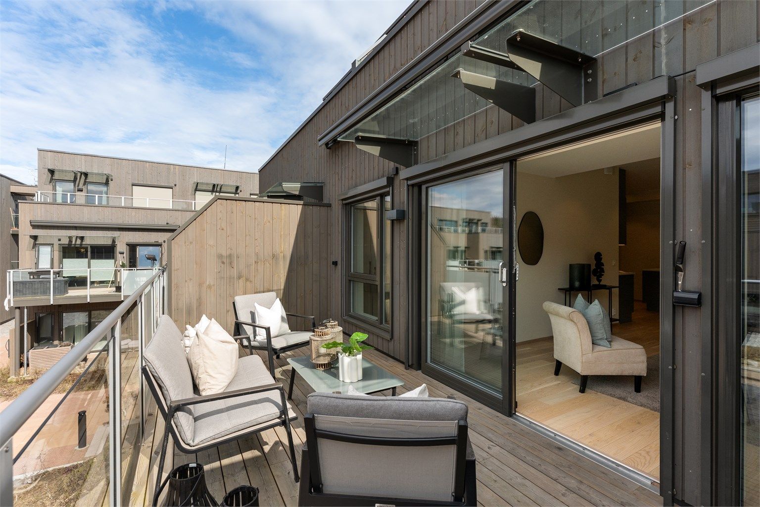 Fra stuen er det utgang til en stor, vestvendt balkong på 14 m². Gulvet er belagt med terrassebord, og rekkverket i metall og glass gir en åpen følelse. Plasseringen gir gode solforhold på ettermiddag og kveld.