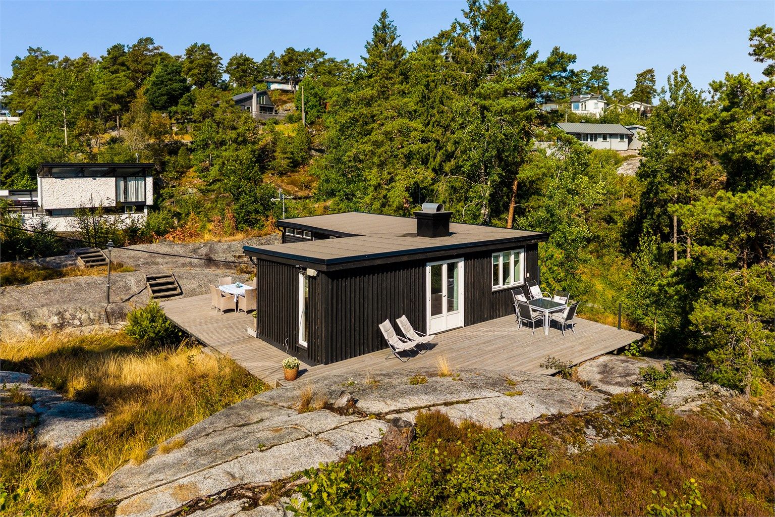 Hytta har et tidløst design, er koselig og praktisk innredet. Den har gode solforhold gjennom hele dagen. Det er ca. 60 meter ned til sjøen med svaberg og fine, små bukter med sandstrender. Nåværende eier har leid båtfeste av grunneier der. Fra hytta er det nydelig utsikt utover sjøen, og det er fine turområder langs kyststien. Hytta er tegnet av den anerkjente arkitekten, Trygve Kleiven og påbygget på slutten av 80-tallet. I 2013 fikk hytta innlagt vann og avløp, og det ble byttet ut kjøkken og bygget et moderne bad.