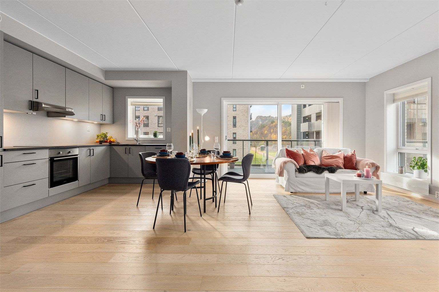 Leiligheten har en lys og innbydende stue med god plass til både tv- og sofaløsning, samt rom til spisebord mot kjøkkenet. De store vindusflatene slipper inn rikelig med naturlig lys og gir rommet en luftig følelse. Stuen har en stavs parkettgulv og malte veggflater som bidrar til et stilrent uttrykk. Her finner du også en praktisk innvendig bod, samt utgang til balkong.