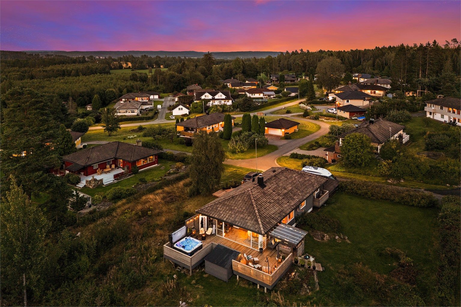 Eiendommen ligger rolig til innerst i blindvei, med flott utsikt, gode sol- og lysforhold og tomt på hele 1.436 kvm – delvis naturtomt med blåbær og villbringebær. Her får du naturen rett på terrassen, jacuzzi, robotklipper og kort vei til skole, barnehage, tog og flotte turområder.