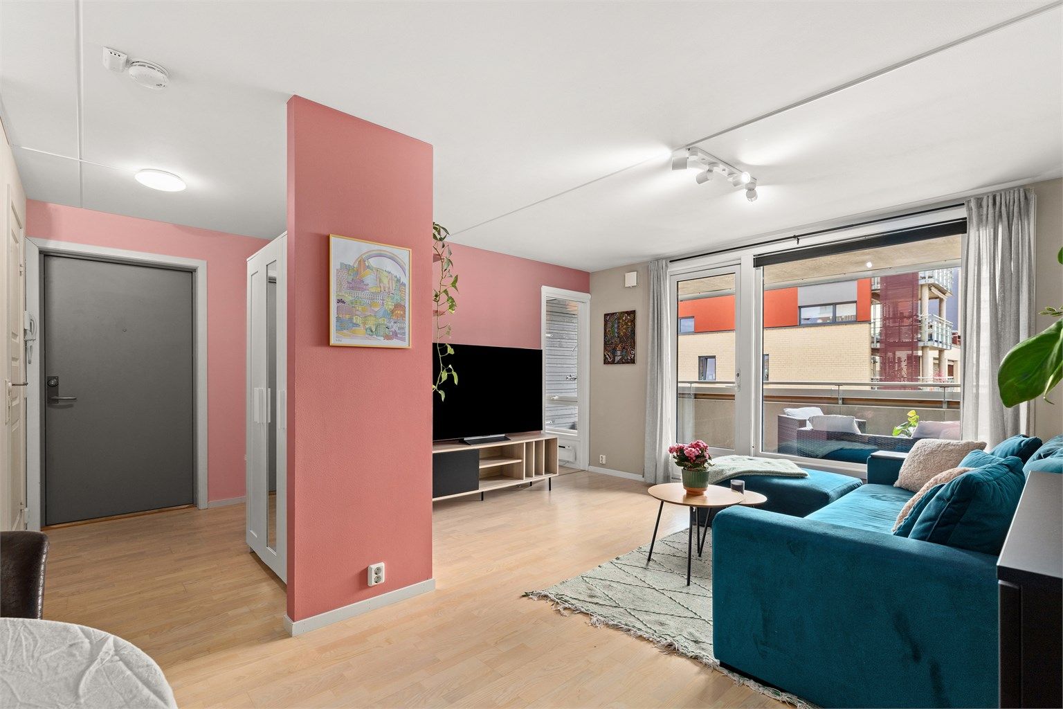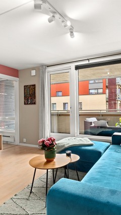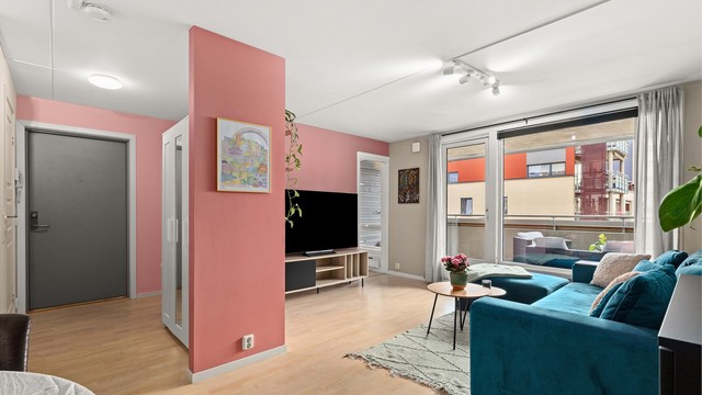 Leiligheten har en åpen stue/kjøkken løsning, noe som gir et sosialt allrom. Her har du god plass til hjørnesofa og annet møblement. Fra stuen har du direkte adkomst til en balkong på 13 kvm. Perfekt forlengelse av stuen på varmere dager, med god plass til møblement. Tilknyttet balkongen har du en bod på 3 kvm.