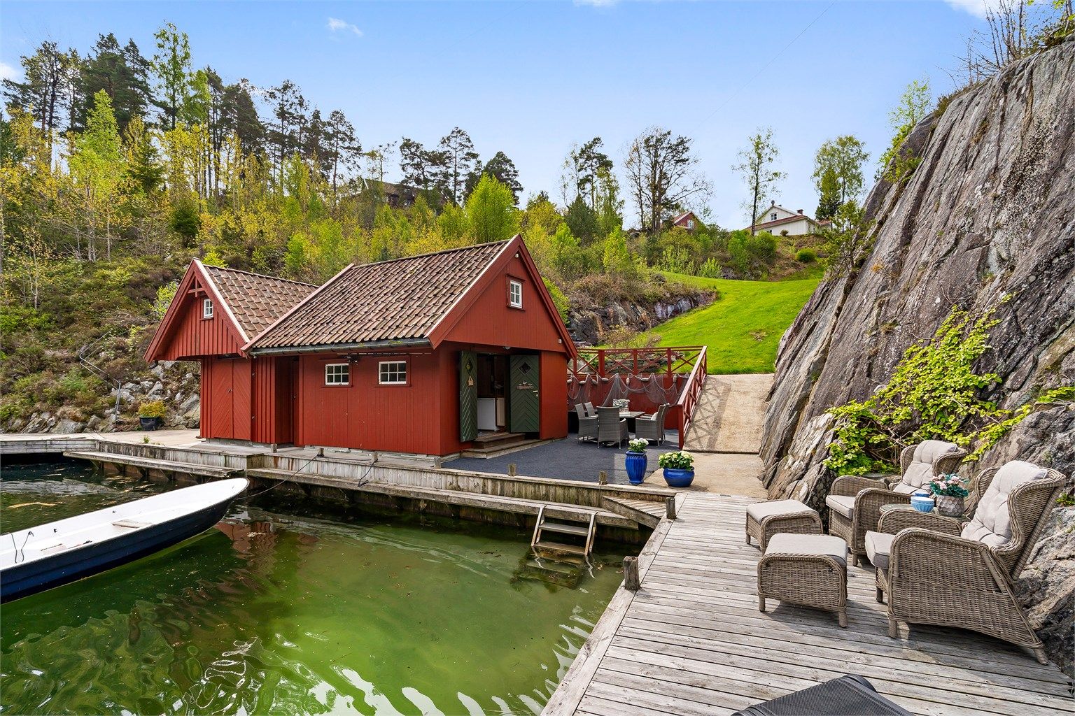 På tomten finnes det både sjøbod, brygge, store hageområder, uteplasser og en stor garasje over to plan. Med sin attraktive beliggenhet på Justøya er det kort nærhet til sjøen og Blindleia og Lillesand sentrum. Store gressplener ned mot sjøen.
