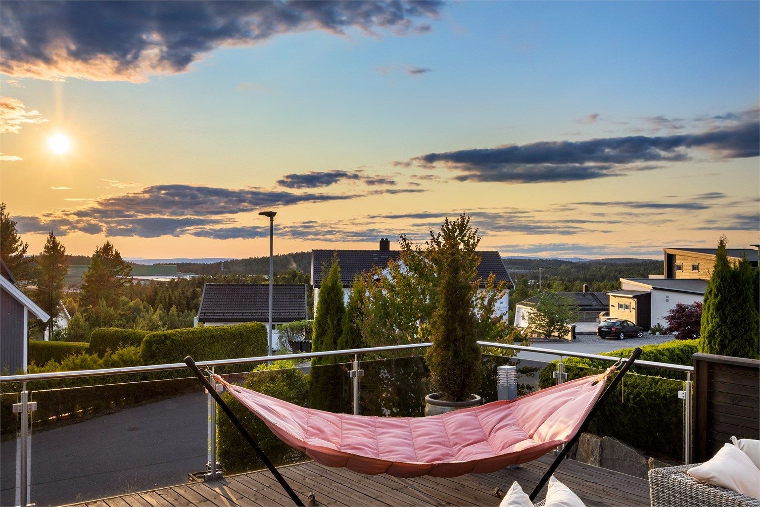 En svært innbydende arkitekttegnet familiebolig med parkmessig opparbeidet tomt. En fantastisk takterrasse med flott utsikt. Stor gressplen, støpt terrasse, veranda og belegningsstein i gårdsplass og foran inngangspartiet. Sol fra morgen til kveld. Boligen består av entré, hall, 2 stuer, kjøkken, 5 soverom, 2 bad, vaskerom og kott. Bergvarmeanlegg med vannbåren gulvvarme i alle rom. Dobbelgarasje med godt med lagringsplass. Biloppstillingsplasser utenfor.