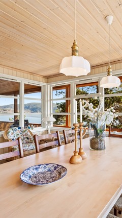 Innbydende sommerhytte med flott fjordutsikt og stor naturtomt på over 6,8 mål. Solrik terrasse på 61 kvm. Nær fjorden.