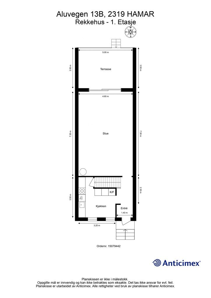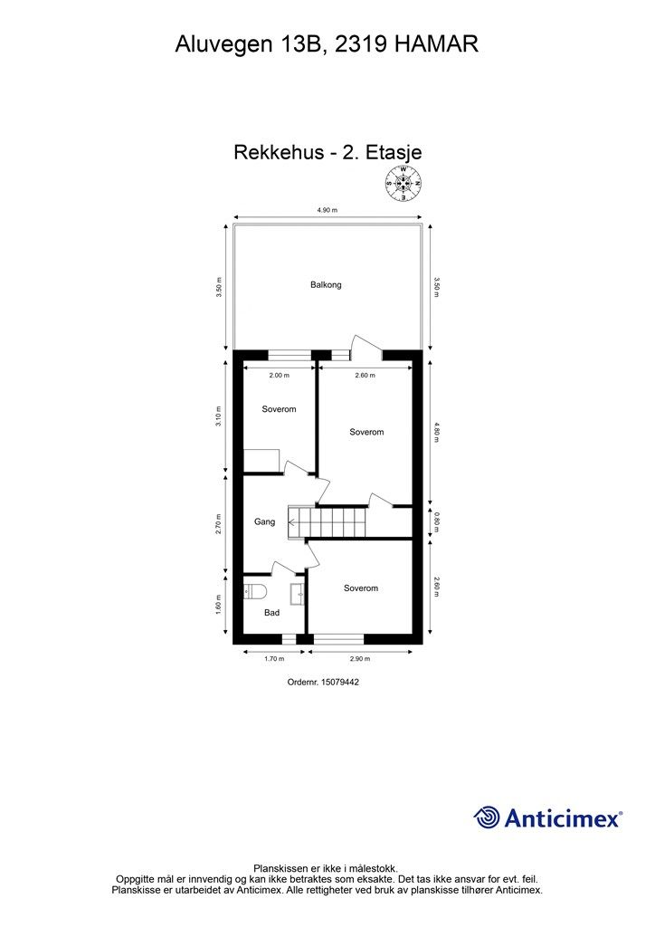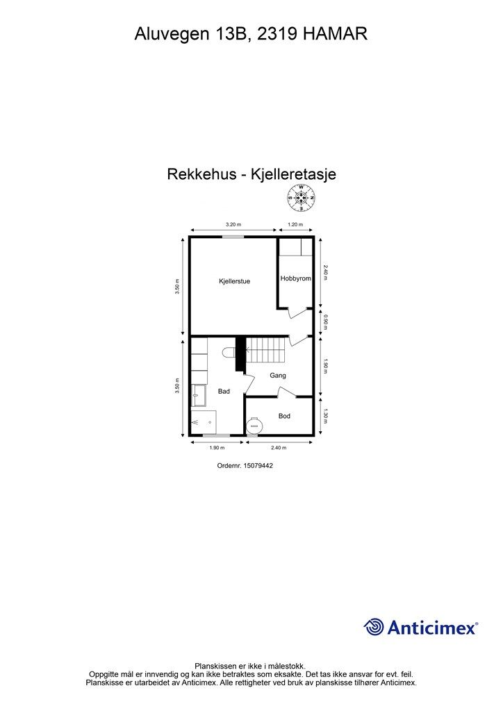 Vedlagte plantegninger er ikke målbare. De oppgitte arealer er hentet fra rapport med befaringsdato 10.04.2026 utført av Anticimex v/Karl Even H. Brukvangen. Arealene er beregnet og rom er definert etter dagens faktiske bruk, uavhengig av hva som er godkjent av bygningsmyndighetene.
