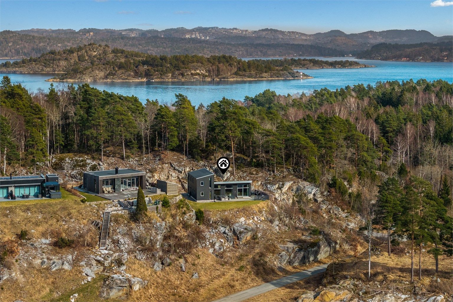 Eiendommen har adkomst via sjøveien med bilferge eller egen båt. Veinettet på øya er privat med felles vedlikeholdsansvar.
