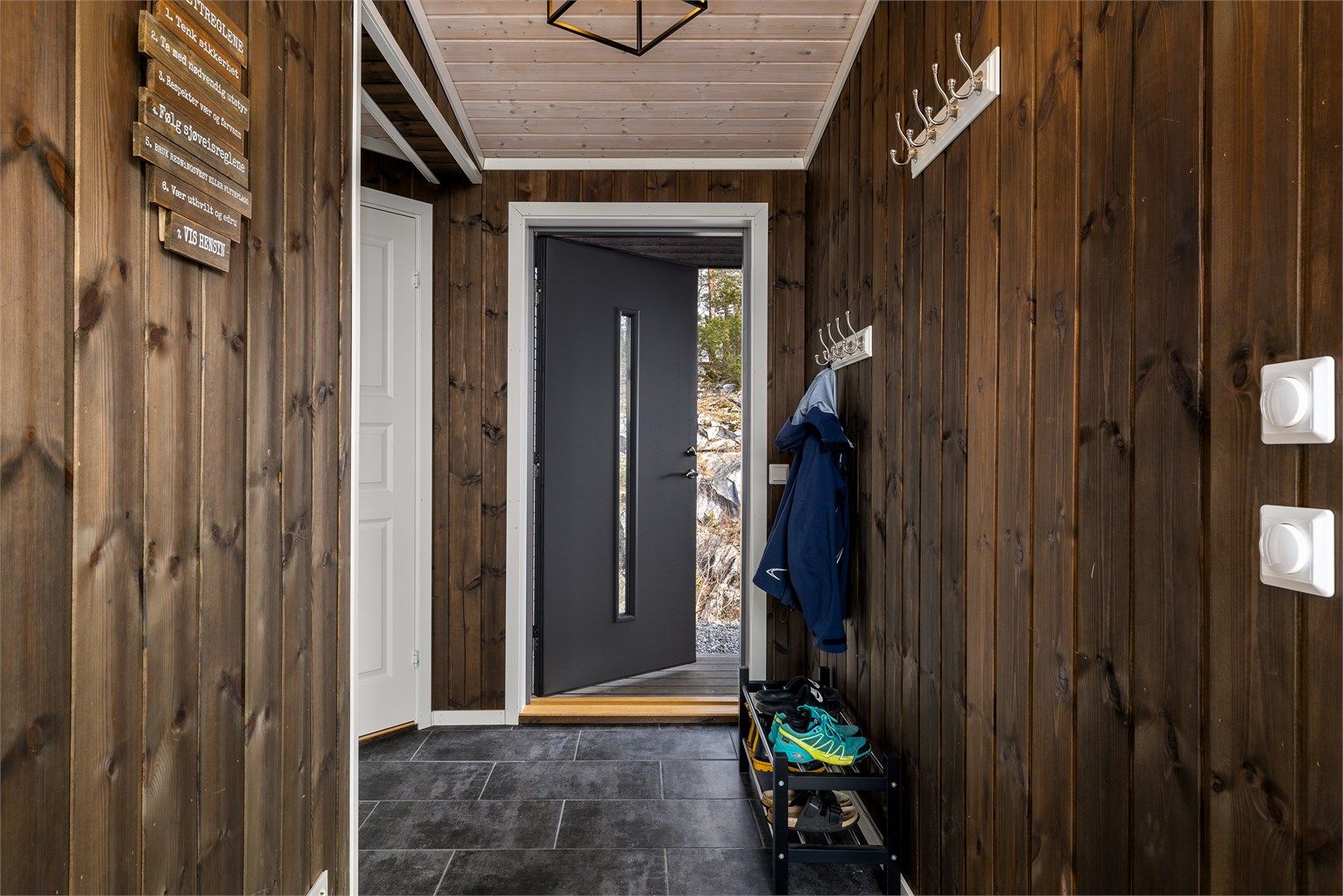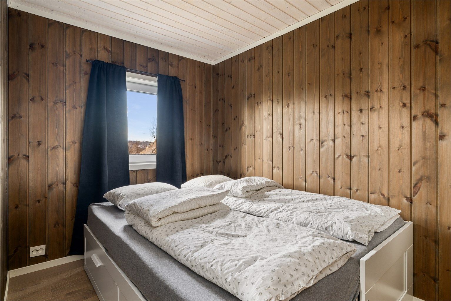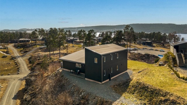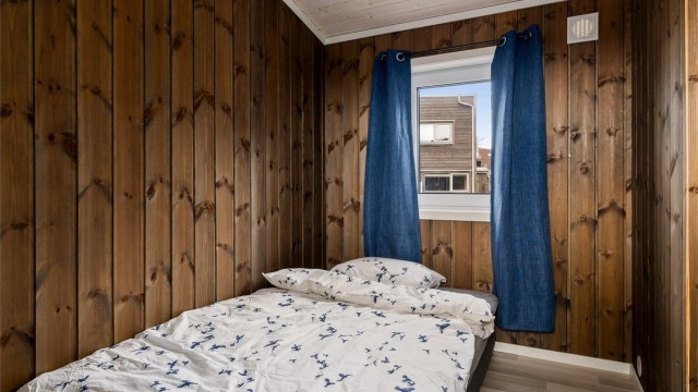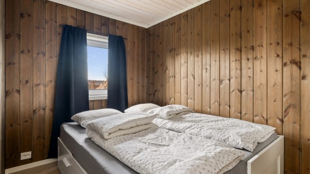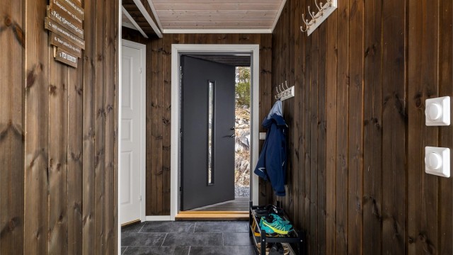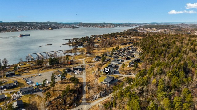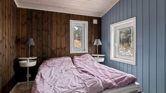 Inne spiller en brunlasert furu sammen med lysets endringer gjennom dagen. Når du beveger deg rundt i hytta ser du ut på den nære naturen. Fra allrommet har du hele Langesundsfjorden i front. Solens vandring rundt hytta gir også skiftende lys, stemninger og farger - avhengig av når på dagen du befinner deg hvor i hytta. For at flere skal kunne bruke hytta samtidig er soverommene lagt mot nord med gang mellom disse og allrommet. Fra gangen går det trapp opp til soverom og bad i 2. etasje. På den måten kan du enkelt kombinere aktivitet og hvile. Hvert av soverommene har plass til dobbeltseng. Gulvene har laminat med flislagt gang og hovedbad. Badet i 2. etasjen har belegg. Vegger med brunbeiset panel og med noen kontrastvegger malt i mørkeblå. Himlinger med hvitlasert panel. Kjøkkeninnredningen med malte heltrefronter, benkeplate i eik og integrerte hvitevarer, oppvaskmaskin, ventilator, stekeovn, koketopp og kjøl-/fryseskap. Det gjøres oppmerksom på at hvitevarene er kjøpt i 2023 og kjøper må forvente slitasje som følge av alder og normal bruk. Begge badene er utstyrt med wc med innebygget cisterne, dusj og servant. Hovedbadet har i tillegg opplegg til vaskemaskin og en stor servantseksjon.