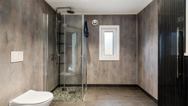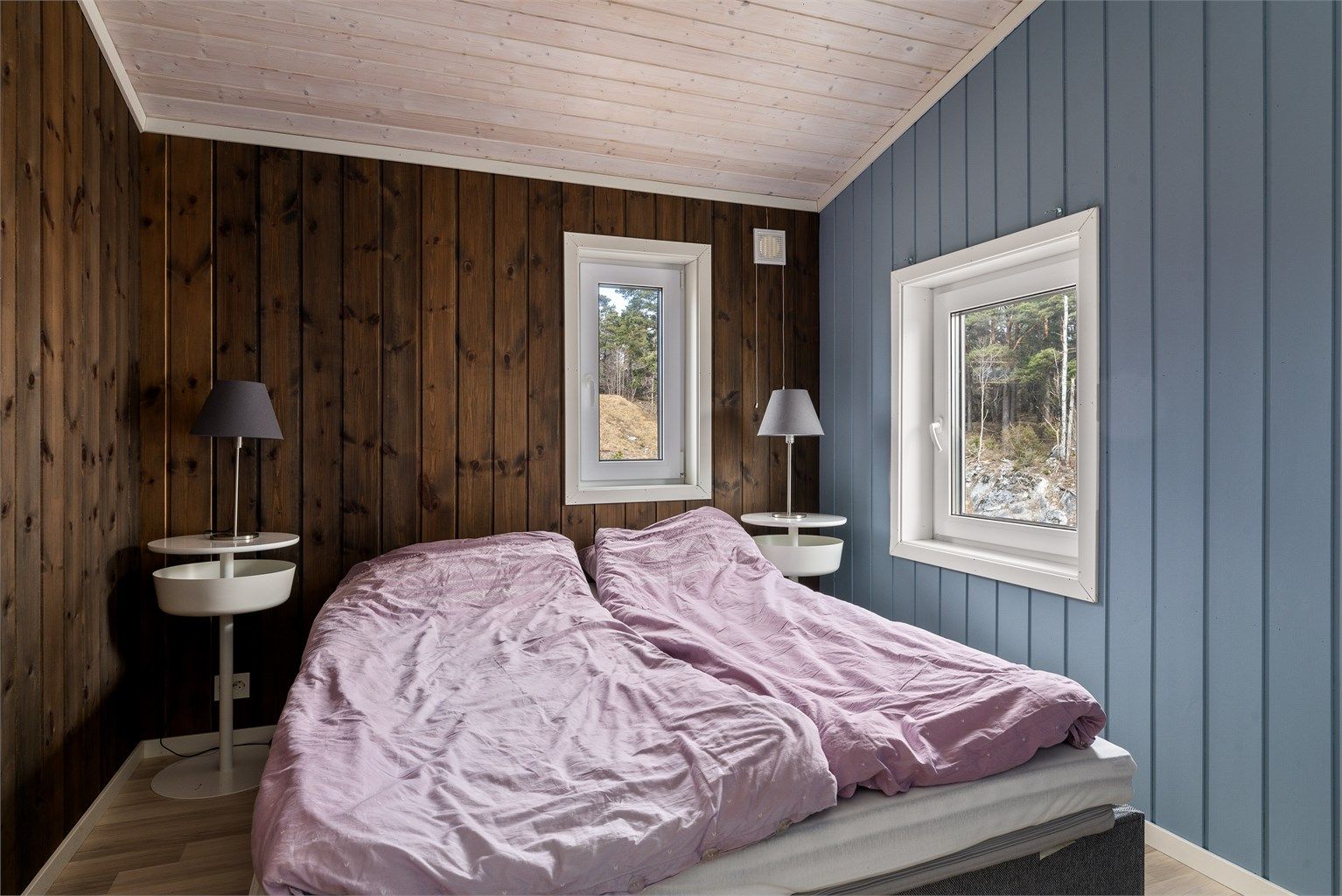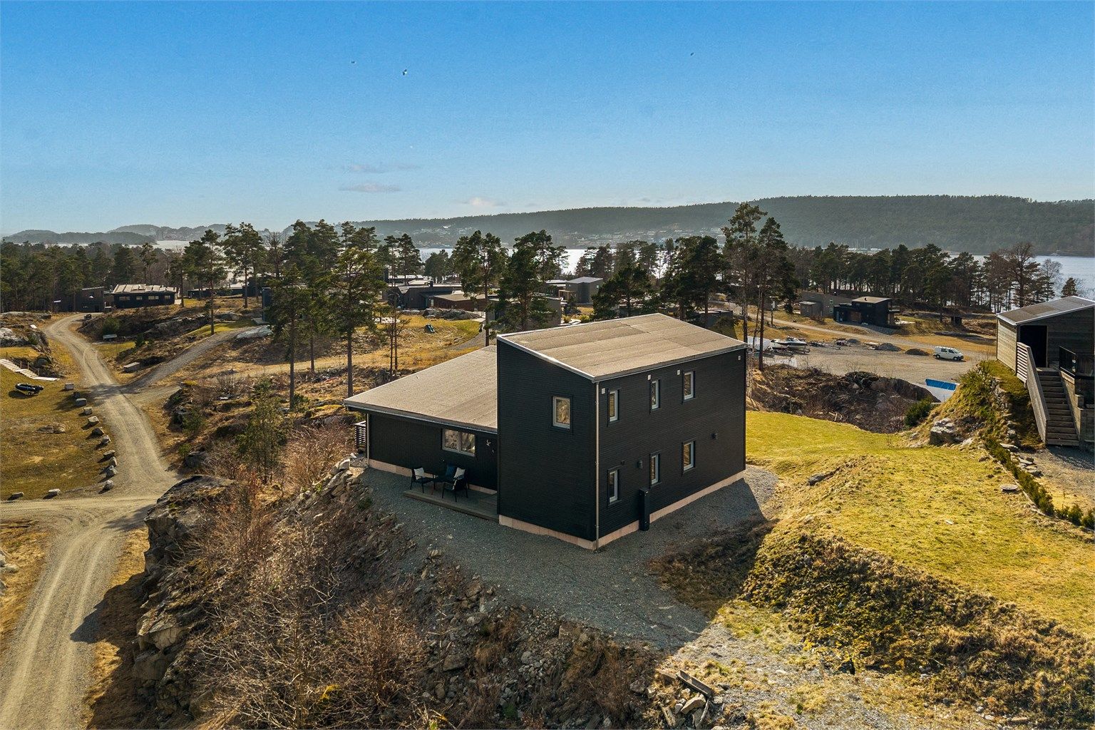 Inne spiller en brunlasert furu sammen med lysets endringer gjennom dagen. Når du beveger deg rundt i hytta ser du ut på den nære naturen. Fra allrommet har du hele Langesundsfjorden i front. Solens vandring rundt hytta gir også skiftende lys, stemninger og farger - avhengig av når på dagen du befinner deg hvor i hytta. For at flere skal kunne bruke hytta samtidig er soverommene lagt mot nord med gang mellom disse og allrommet. Fra gangen går det trapp opp til soverom og bad i 2. etasje. På den måten kan du enkelt kombinere aktivitet og hvile. Hvert av soverommene har plass til dobbeltseng. Gulvene har laminat med flislagt gang og hovedbad. Badet i 2. etasjen har belegg. Vegger med brunbeiset panel og med noen kontrastvegger malt i mørkeblå. Himlinger med hvitlasert panel. Kjøkkeninnredningen med malte heltrefronter, benkeplate i eik og integrerte hvitevarer, oppvaskmaskin, ventilator, stekeovn, koketopp og kjøl-/fryseskap. Det gjøres oppmerksom på at hvitevarene er kjøpt i 2023 og kjøper må forvente slitasje som følge av alder og normal bruk. Begge badene er utstyrt med wc med innebygget cisterne, dusj og servant. Hovedbadet har i tillegg opplegg til vaskemaskin og en stor servantseksjon.