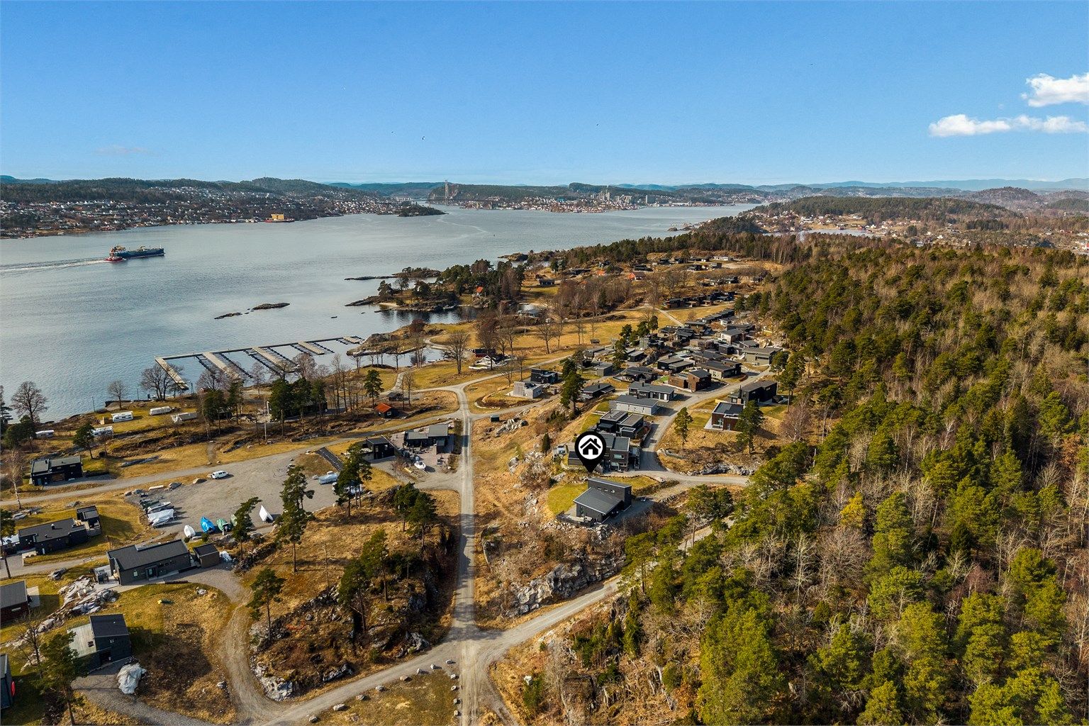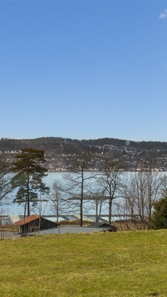 Eiet tomt på 663 kvm. som ligger på toppen av "500" feltet" med fritt utsyn til sjøen og friarealer. Herfra kan du se ned til bryggeanlegget hvor det medfølger båtplass på 3,5 meter. Hytta ligger bare noen få minutters gange unna. Her er gressplen i front og gruset adkomst. Stor vest- og sydvendt terrasse i trevirke.
