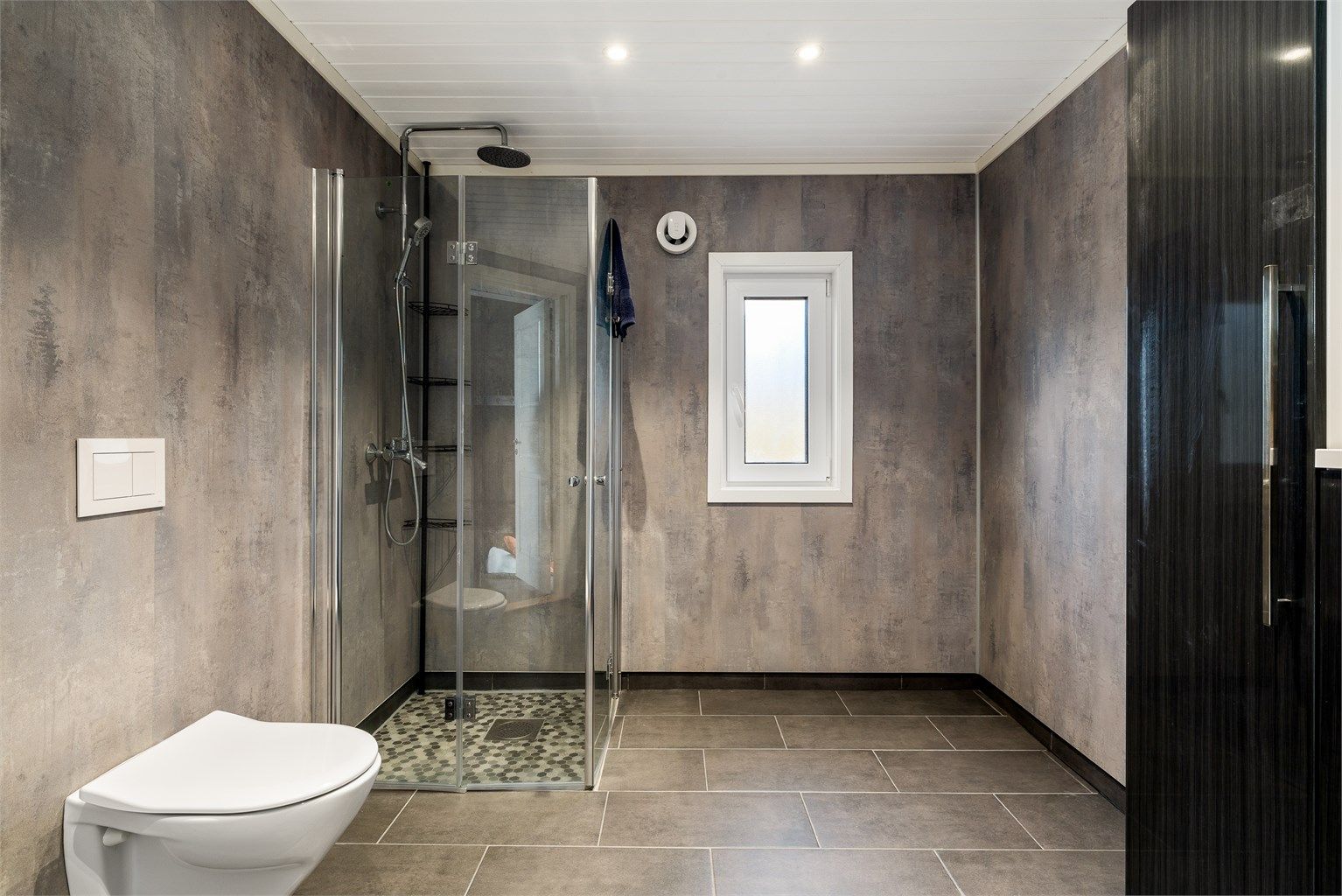 Stedvis motfall på gulvflater utenfor dusjsone, gjelder begge bad.